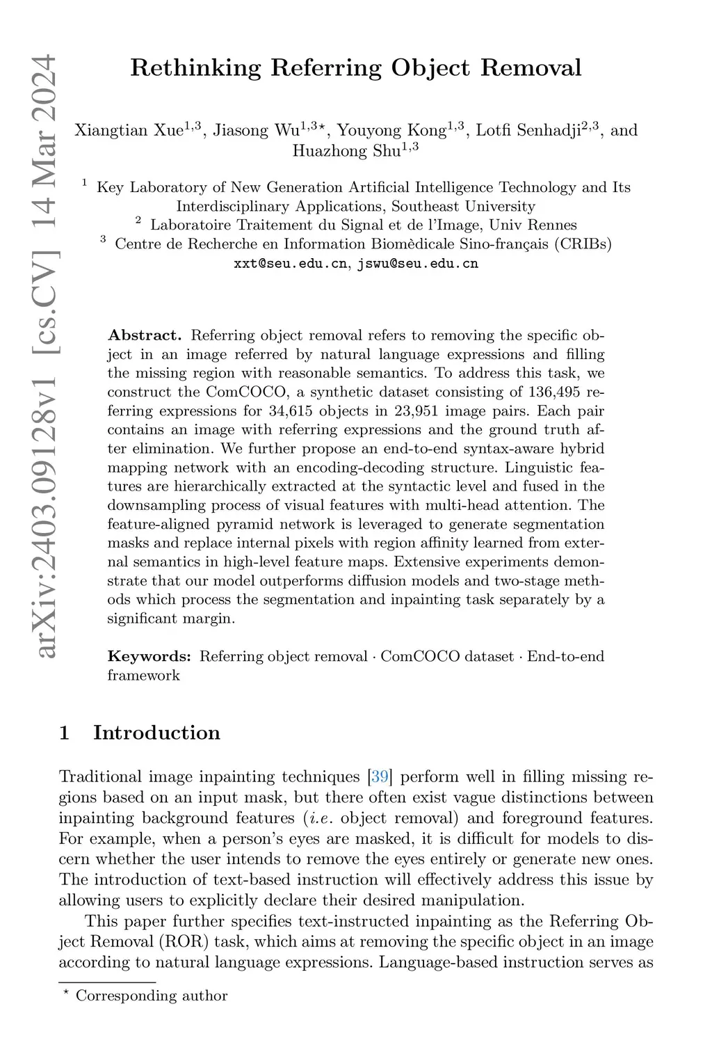 Referring object removal refers to removing the specific object in an image referred by natural language expressions and filling the missing region with reasonable semantics. To address this task, we construct the ComCOCO, a synthetic dataset consisting of 136,495 referring expressions for 34,615 objects in 23,951 image pairs. Each pair contains an image with referring expressions and the ground truth after elimination. We further propose an end-to-end syntax-aware hybrid mapping network with an encoding-decoding structure. Linguistic features are hierarchically extracted at the syntactic level and fused in the downsampling process of visual features with multi-head attention. The feature-aligned pyramid network is leveraged to generate segmentation masks and replace internal pixels with region affinity learned from external semantics in high-level feature maps. Extensive experiments demonstrate that our model outperforms diffusion models and two-stage methods which process the segmentation and inpainting task separately by a significant margin.