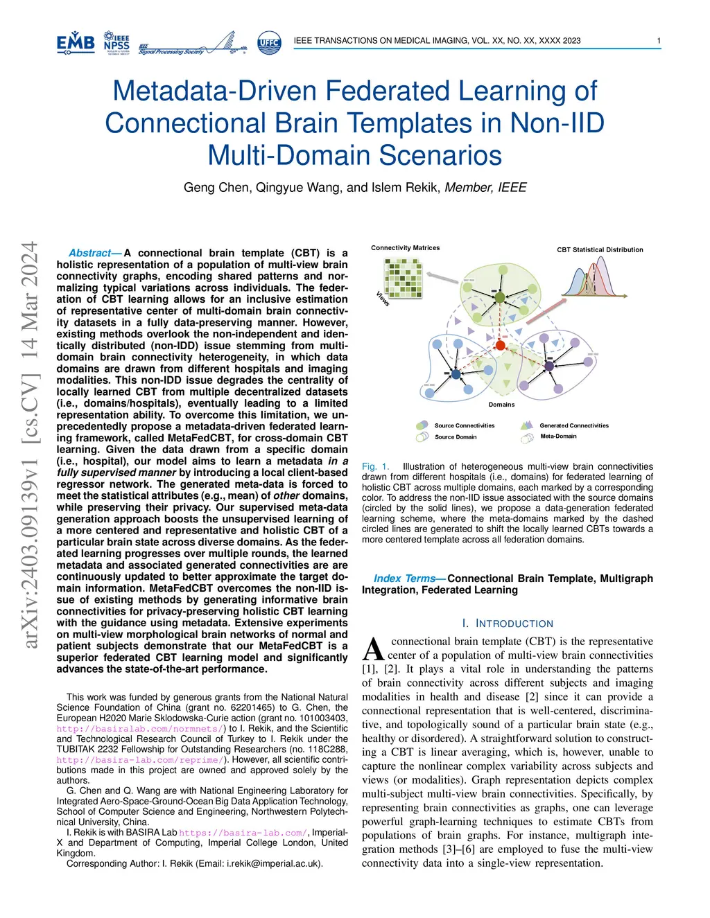 A connectional brain template (CBT) is a holistic representation of a population of multi-view brain connectivity graphs, encoding shared patterns and normalizing typical variations across individuals. The federation of CBT learning allows for an inclusive estimation of the representative center of multi-domain brain connectivity datasets in a fully data-preserving manner. However, existing methods overlook the non-independent and identically distributed (non-IDD) issue stemming from multidomain brain connectivity heterogeneity, in which data domains are drawn from different hospitals and imaging modalities. To overcome this limitation, we unprecedentedly propose a metadata-driven federated learning framework, called MetaFedCBT, for cross-domain CBT learning. Given the data drawn from a specific domain (i.e., hospital), our model aims to learn metadata in a fully supervised manner by introducing a local client-based regressor network. The generated meta-data is forced to meet the statistical attributes (e.g., mean) of other domains, while preserving their privacy. Our supervised meta-data generation approach boosts the unsupervised learning of a more centered, representative, and holistic CBT of a particular brain state across diverse domains. As the federated learning progresses over multiple rounds, the learned metadata and associated generated connectivities are continuously updated to better approximate the target domain information. MetaFedCBT overcomes the non-IID issue of existing methods by generating informative brain connectivities for privacy-preserving holistic CBT learning with guidance using metadata. Extensive experiments on multi-view morphological brain networks of normal and patient subjects demonstrate that our MetaFedCBT is a superior federated CBT learning model and significantly advances the state-of-the-art performance.