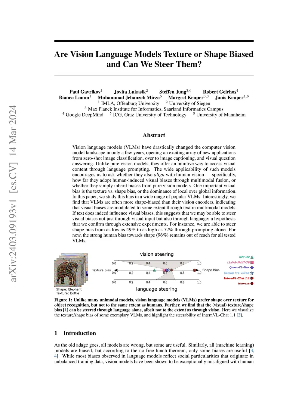 Vision language models (VLMs) have drastically changed the computer vision model landscape in only a few years, opening an exciting array of new applications from zero-shot image classification, over to image captioning, and visual question answering. Unlike pure vision models, they offer an intuitive way to access visual content through language prompting. The wide applicability of such models encourages us to ask whether they also align with human vision - specifically, how far they adopt human-induced visual biases through multimodal fusion, or whether they simply inherit biases from pure vision models. One important visual bias is the texture vs. shape bias, or the dominance of local over global information. In this paper, we study this bias in a wide range of popular VLMs. Interestingly, we find that VLMs are often more shape-biased than their vision encoders, indicating that visual biases are modulated to some extent through text in multimodal models. If text does indeed influence visual biases, this suggests that we may be able to steer visual biases not just through visual input but also through language: a hypothesis that we confirm through extensive experiments. For instance, we are able to steer shape bias from as low as 49% to as high as 72% through prompting alone. For now, the strong human bias towards shape (96%) remains out of reach for all tested VLMs.