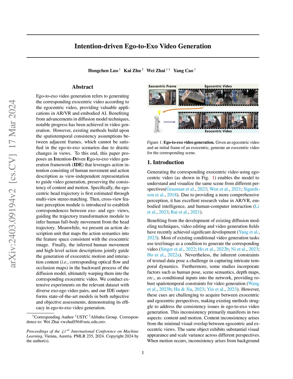 Ego-to-exo video generation refers to generating the corresponding exocentric video according to the egocentric video, providing valuable applications in AR/VR and embodied AI. Benefiting from advancements in diffusion model techniques, notable progress has been achieved in video generation. However, existing methods build upon the spatiotemporal consistency assumptions between adjacent frames, which cannot be satisfied in the ego-to-exo scenarios due to drastic changes in views. To this end, this paper proposes an Intention-Driven Ego-to-exo video generation framework (IDE) that leverages action intention consisting of human movement and action description as view-independent representation to guide video generation, preserving the consistency of content and motion. Specifically, the egocentric head trajectory is first estimated through multi-view stereo matching. Then, cross-view feature perception module is introduced to establish correspondences between exo- and ego- views, guiding the trajectory transformation module to infer human full-body movement from the head trajectory. Meanwhile, we present an action description unit that maps the action semantics into the feature space consistent with the exocentric image. Finally, the inferred human movement and high-level action descriptions jointly guide the generation of exocentric motion and interaction content (i.e., corresponding optical flow and occlusion maps) in the backward process of the diffusion model, ultimately warping them into the corresponding exocentric video. We conduct extensive experiments on the relevant dataset with diverse exo-ego video pairs, and our IDE outperforms state-of-the-art models in both subjective and objective assessments, demonstrating its efficacy in ego-to-exo video generation.