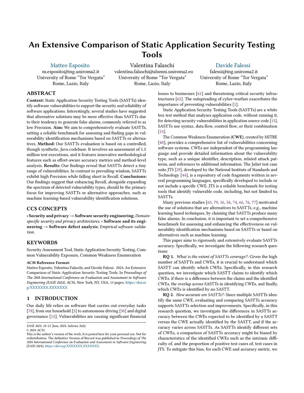 Context: Static Application Security Testing Tools (SASTTs) identify software vulnerabilities to support the security and reliability of software applications. Interestingly, several studies have suggested that alternative solutions may be more effective than SASTTs due to their tendency to generate false alarms, commonly referred to as low Precision. Aim: We aim to comprehensively evaluate SASTTs, setting a reliable benchmark for assessing and finding gaps in vulnerability identification mechanisms based on SASTTs or alternatives. Method: Our SASTTs evaluation is based on a controlled, though synthetic, Java codebase. It involves an assessment of 1.5 million test executions, and it features innovative methodological features such as effort-aware accuracy metrics and method-level analysis. Results: Our findings reveal that SASTTs detect a tiny range of vulnerabilities. In contrast to prevailing wisdom, SASTTs exhibit high Precision while falling short in Recall. Conclusions: The paper suggests that enhancing Recall, alongside expanding the spectrum of detected vulnerability types, should be the primary focus for improving SASTTs or alternative approaches, such as machine learning-based vulnerability identification solutions.