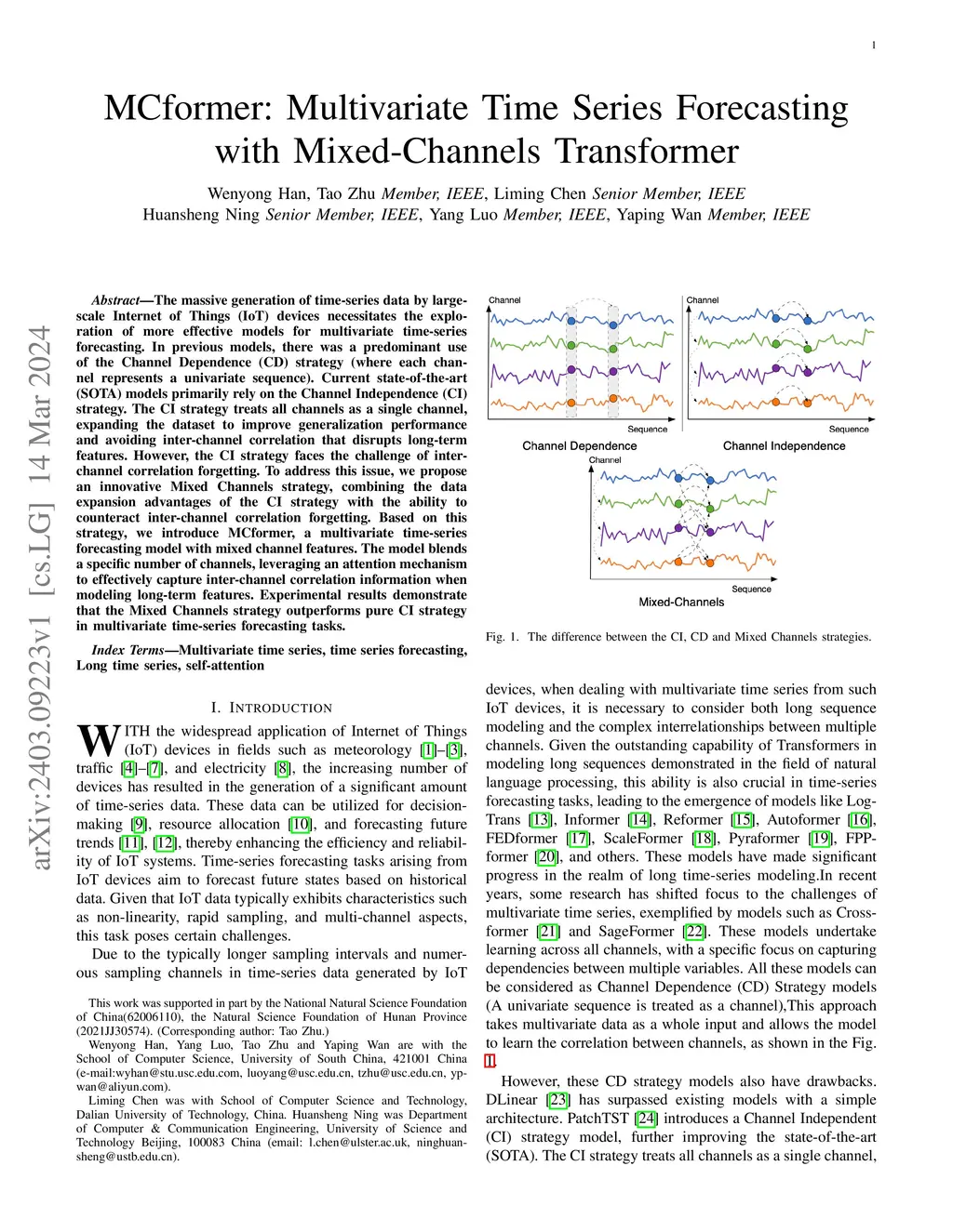 The massive generation of time-series data by largescale Internet of Things (IoT) devices necessitates the exploration of more effective models for multivariate time-series forecasting. In previous models, there was a predominant use of the Channel Dependence (CD) strategy (where each channel represents a univariate sequence). Current state-of-the-art (SOTA) models primarily rely on the Channel Independence (CI) strategy. The CI strategy treats all channels as a single channel, expanding the dataset to improve generalization performance and avoiding inter-channel correlation that disrupts long-term features. However, the CI strategy faces the challenge of interchannel correlation forgetting. To address this issue, we propose an innovative Mixed Channels strategy, combining the data expansion advantages of the CI strategy with the ability to counteract inter-channel correlation forgetting. Based on this strategy, we introduce MCformer, a multivariate time-series forecasting model with mixed channel features. The model blends a specific number of channels, leveraging an attention mechanism to effectively capture inter-channel correlation information when modeling long-term features. Experimental results demonstrate that the Mixed Channels strategy outperforms pure CI strategy in multivariate time-series forecasting tasks.