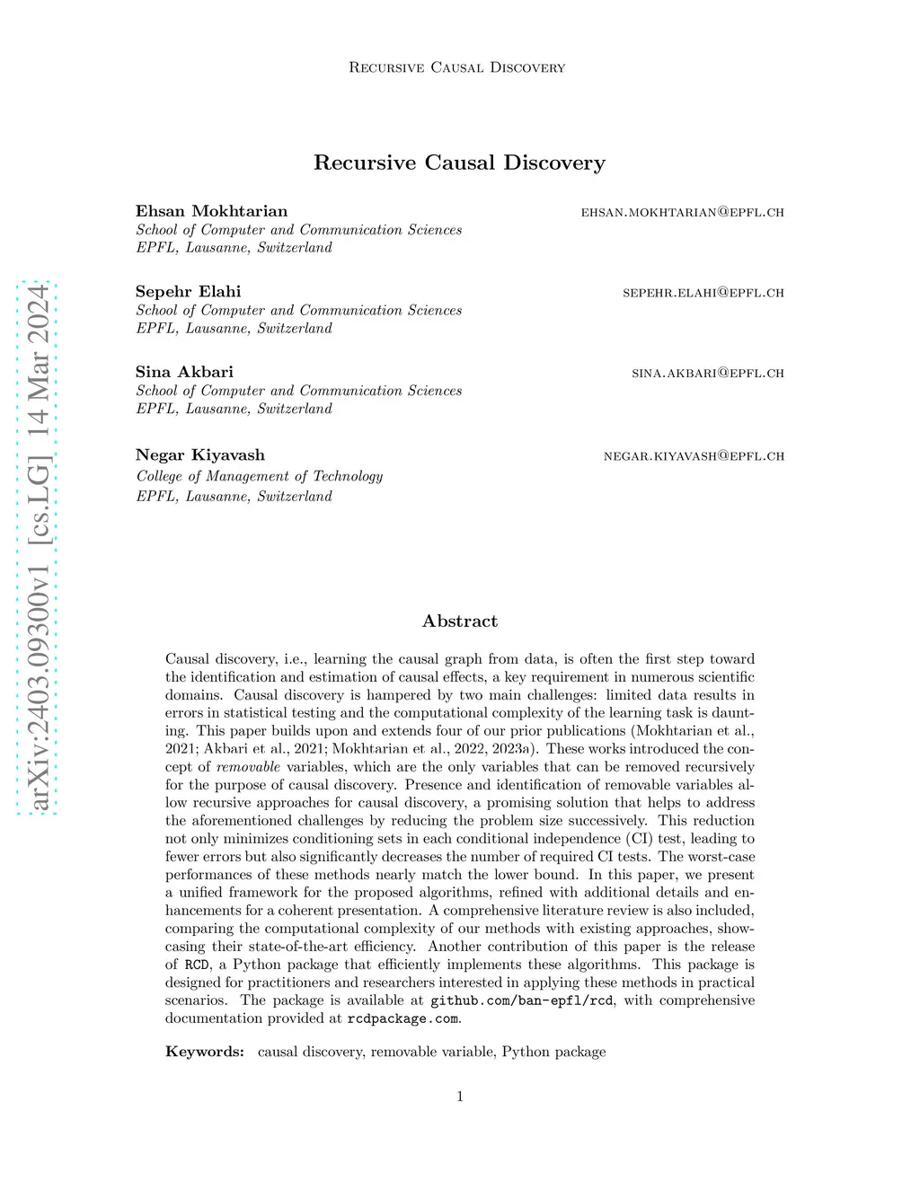 Causal discovery, i.e., learning the causal graph from data, is often the first step toward the identification and estimation of causal effects, a key requirement in numerous scientific domains. Causal discovery is hampered by two main challenges: limited data results in errors in statistical testing and the computational complexity of the learning task is daunting. This paper builds upon and extends four of our prior publications (Mokhtarian et al., 2021; Akbari et al., 2021; Mokhtarian et al., 2022, 2023a). These works introduced the concept of removable variables, which are the only variables that can be removed recursively for the purpose of causal discovery. Presence and identification of removable variables allow recursive approaches for causal discovery, a promising solution that helps to address the aforementioned challenges by reducing the problem size successively. This reduction not only minimizes conditioning sets in each conditional independence (CI) test, leading to fewer errors but also significantly decreases the number of required CI tests. The worst-case performances of these methods nearly match the lower bound. In this paper, we present a unified framework for the proposed algorithms, refined with additional details and enhancements for a coherent presentation. A comprehensive literature review is also included, comparing the computational complexity of our methods with existing approaches, showcasing their state-of-the-art efficiency. Another contribution of this paper is the release of RCD, a Python package that efficiently implements these algorithms. This package is designed for practitioners and researchers interested in applying these methods in practical scenarios. The package is available at github.com/ban-epfl/rcd, with comprehensive documentation provided at rcdpackage.com.