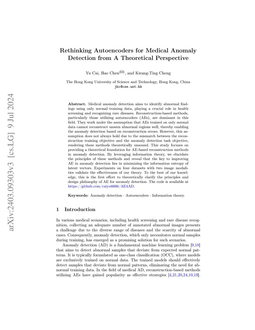 Medical anomaly detection aims to identify abnormal findings using only normal training data, playing a crucial role in health screening and recognizing rare diseases. Reconstruction-based methods, particularly those utilizing autoencoders (AEs), are dominant in this field. They work under the assumption that AEs trained on only normal data cannot reconstruct unseen abnormal regions well, thereby enabling the anomaly detection based on reconstruction errors. However, this assumption does not always hold due to the mismatch between the reconstruction training objective and the anomaly detection task objective, rendering these methods theoretically unsound. This study focuses on providing a theoretical foundation for AE-based reconstruction methods in anomaly detection. By leveraging information theory, we elucidate the principles of these methods and reveal that the key to improving AE in anomaly detection lies in minimizing the information entropy of latent vectors. Experiments on four datasets with two image modalities validate the effectiveness of our theory. To the best of our knowledge, this is the first effort to theoretically clarify the principles and design philosophy of AE for anomaly detection. The code is available at \url{https://github.com/caiyu6666/AE4AD}.