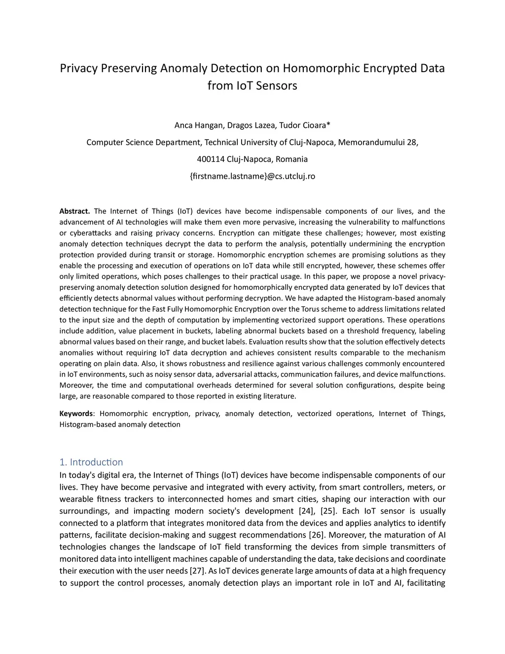 IoT devices have become indispensable components of our lives, and the advancement of AI technologies will make them even more pervasive, increasing the vulnerability to malfunctions or cyberattacks and raising privacy concerns. Encryption can mitigate these challenges; however, most existing anomaly detection techniques decrypt the data to perform the analysis, potentially undermining the encryption protection provided during transit or storage. Homomorphic encryption schemes are promising solutions as they enable the processing and execution of operations on IoT data while still encrypted, however, these schemes offer only limited operations, which poses challenges to their practical usage. In this paper, we propose a novel privacy-preserving anomaly detection solution designed for homomorphically encrypted data generated by IoT devices that efficiently detects abnormal values without performing decryption. We have adapted the Histogram-based anomaly detection technique for TFHE scheme to address limitations related to the input size and the depth of computation by implementing vectorized support operations. These operations include addition, value placement in buckets, labeling abnormal buckets based on a threshold frequency, labeling abnormal values based on their range, and bucket labels. Evaluation results show that the solution effectively detects anomalies without requiring data decryption and achieves consistent results comparable to the mechanism operating on plain data. Also, it shows robustness and resilience against various challenges commonly encountered in IoT environments, such as noisy sensor data, adversarial attacks, communication failures, and device malfunctions. Moreover, the time and computational overheads determined for several solution configurations, despite being large, are reasonable compared to those reported in existing literature.
