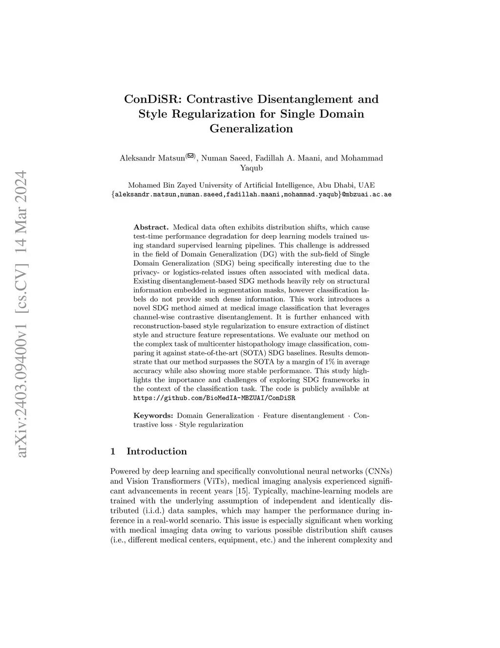ConDiSR: Contrastive Disentanglement and Style Regularization for Single