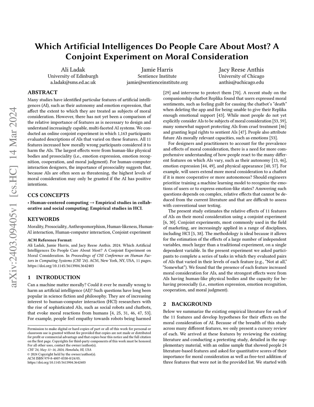 Many studies have identified particular features of artificial intelligences (AI), such as their autonomy and emotion expression, that affect the extent to which they are treated as subjects of moral consideration. However, there has not yet been a comparison of the relative importance of features as is necessary to design and understand increasingly capable, multi-faceted AI systems. We conducted an online conjoint experiment in which 1,163 participants evaluated descriptions of AIs that varied on these features. All 11 features increased how morally wrong participants considered it to harm the AIs. The largest effects were from human-like physical bodies and prosociality (i.e., emotion expression, emotion recognition, cooperation, and moral judgment). For human-computer interaction designers, the importance of prosociality suggests that, because AIs are often seen as threatening, the highest levels of moral consideration may only be granted if the AI has positive intentions.