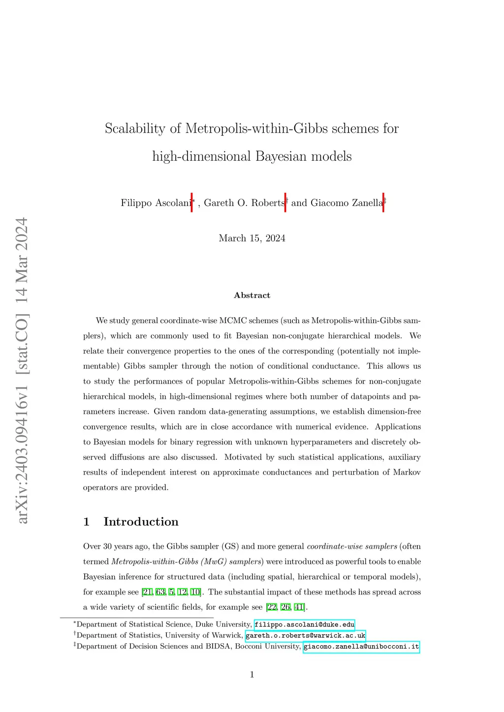 We study general coordinate-wise MCMC schemes (such as Metropolis-within-Gibbs samplers), which are commonly used to fit Bayesian non-conjugate hierarchical models. We relate their convergence properties to the ones of the corresponding (potentially not implementable) Gibbs sampler through the notion of conditional conductance. This allows us to study the performances of popular Metropolis-within-Gibbs schemes for non-conjugate hierarchical models, in high-dimensional regimes where both number of datapoints and parameters increase. Given random data-generating assumptions, we establish dimension-free convergence results, which are in close accordance with numerical evidences. Applications to Bayesian models for binary regression with unknown hyperparameters and discretely observed diffusions are also discussed. Motivated by such statistical applications, auxiliary results of independent interest on approximate conductances and perturbation of Markov operators are provided.