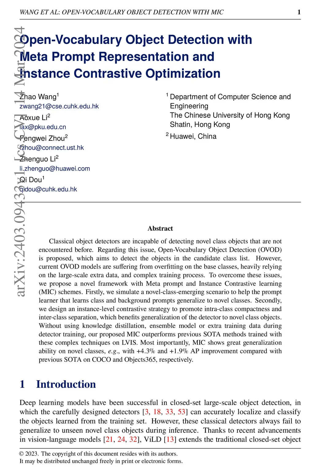 Classical object detectors are incapable of detecting novel class objects that are not encountered before. Regarding this issue, Open-Vocabulary Object Detection (OVOD) is proposed, which aims to detect the objects in the candidate class list. However, current OVOD models are suffering from overfitting on the base classes, heavily relying on the large-scale extra data, and complex training process. To overcome these issues, we propose a novel framework with Meta prompt and Instance Contrastive learning (MIC) schemes. Firstly, we simulate a novel-class-emerging scenario to help the prompt learner that learns class and background prompts generalize to novel classes. Secondly, we design an instance-level contrastive strategy to promote intra-class compactness and inter-class separation, which benefits generalization of the detector to novel class objects. Without using knowledge distillation, ensemble model or extra training data during detector training, our proposed MIC outperforms previous SOTA methods trained with these complex techniques on LVIS. Most importantly, MIC shows great generalization ability on novel classes, e.g., with and improvement compared with previous SOTA on COCO and Objects365, respectively.