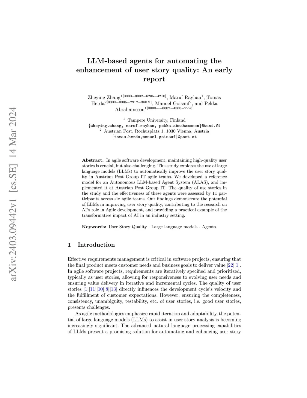In agile software development, maintaining high-quality user stories is crucial, but also challenging. This study explores the use of large language models to automatically improve the user story quality in Austrian Post Group IT agile teams. We developed a reference model for an Autonomous LLM-based Agent System and implemented it at the company. The quality of user stories in the study and the effectiveness of these agents for user story quality improvement was assessed by 11 participants across six agile teams. Our findings demonstrate the potential of LLMs in improving user story quality, contributing to the research on AI role in agile development, and providing a practical example of the transformative impact of AI in an industry setting.