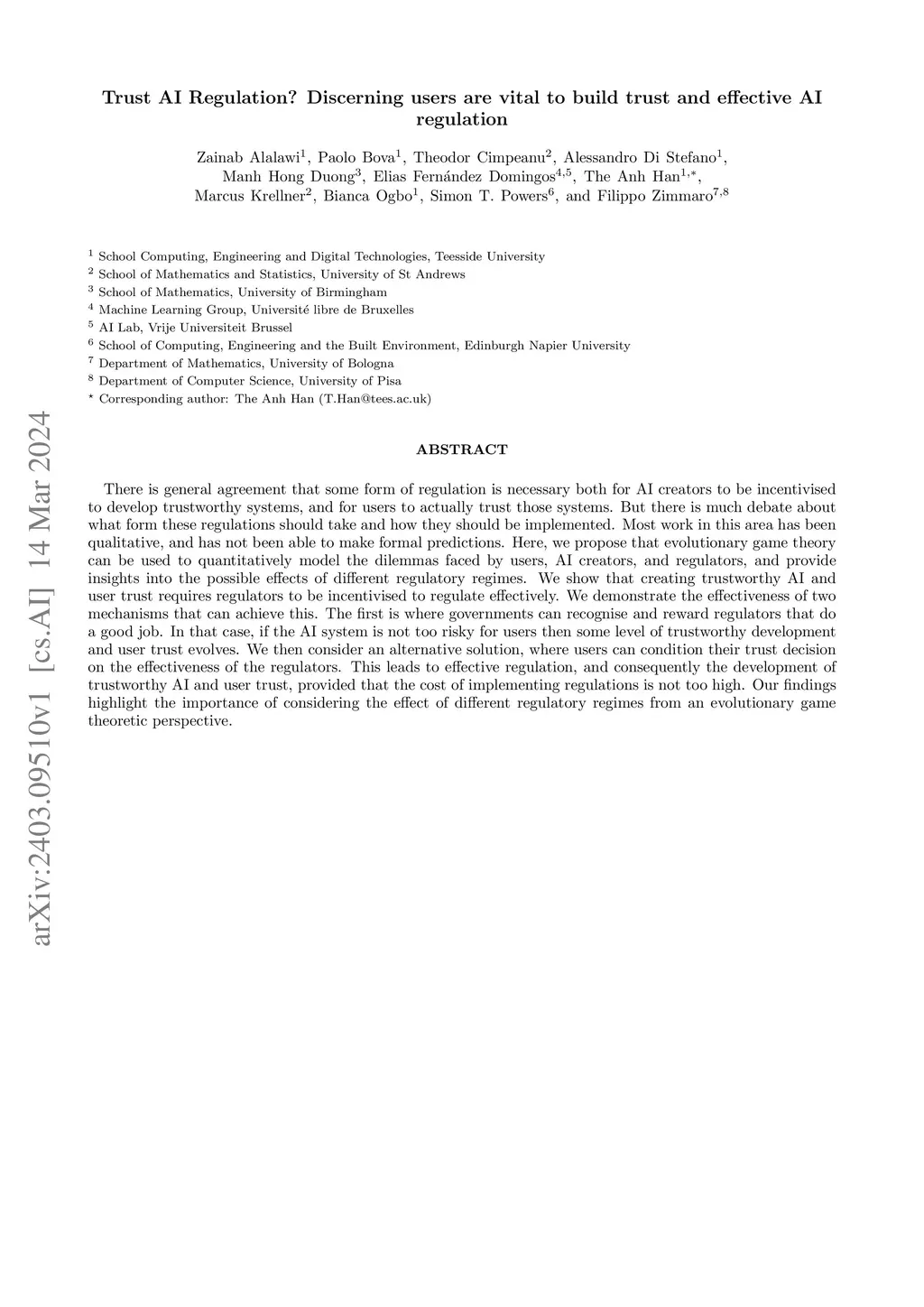 There is general agreement that some form of regulation is necessary both for AI creators to be incentivised to develop trustworthy systems, and for users to actually trust those systems. But there is much debate about what form these regulations should take and how they should be implemented. Most work in this area has been qualitative, and has not been able to make formal predictions. Here, we propose that evolutionary game theory can be used to quantitatively model the dilemmas faced by users, AI creators, and regulators, and provide insights into the possible effects of different regulatory regimes. We show that creating trustworthy AI and user trust requires regulators to be incentivised to regulate effectively. We demonstrate the effectiveness of two mechanisms that can achieve this. The first is where governments can recognise and reward regulators that do a good job. In that case, if the AI system is not too risky for users then some level of trustworthy development and user trust evolves. We then consider an alternative solution, where users can condition their trust decision on the effectiveness of the regulators. This leads to effective regulation, and consequently the development of trustworthy AI and user trust, provided that the cost of implementing regulations is not too high. Our findings highlight the importance of considering the effect of different regulatory regimes from an evolutionary game theoretic perspective.