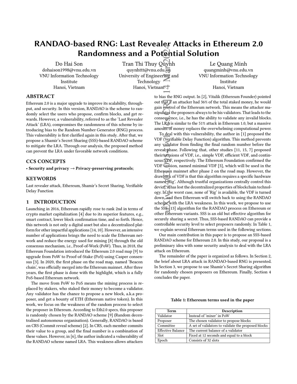 Ethereum 2.0 is a major upgrade to improve its scalability, throughput, and security. In this version, RANDAO is the scheme to randomly select the users who propose, confirm blocks, and get rewards. However, a vulnerability, referred to as the `Last Revealer Attack' (LRA), compromises the randomness of this scheme by introducing bias to the Random Number Generator (RNG) process. This vulnerability is first clarified again in this study. After that, we propose a Shamir's Secret Sharing (SSS)-based RANDAO scheme to mitigate the LRA. Through our analysis, the proposed method can prevent the LRA under favorable network conditions.
