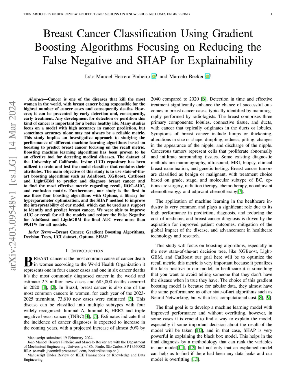 Breast Cancer Classification Using Gradient Boosting Algorithms Focusing on Reducing the False Negative and SHAP for Explainability