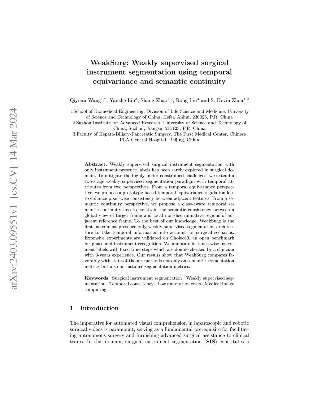 Weakly supervised surgical instrument segmentation with only instrument presence labels has been rarely explored in surgical domain. To mitigate the highly under-constrained challenges, we extend a two-stage weakly supervised segmentation paradigm with temporal attributes from two perspectives. From a temporal equivariance perspective, we propose a prototype-based temporal equivariance regulation loss to enhance pixel-wise consistency between adjacent features. From a semantic continuity perspective, we propose a class-aware temporal semantic continuity loss to constrain the semantic consistency between a global view of target frame and local non-discriminative regions of adjacent reference frame. To the best of our knowledge, WeakSurg is the first instrument-presence-only weakly supervised segmentation architecture to take temporal information into account for surgical scenarios. Extensive experiments are validated on Cholec80, an open benchmark for phase and instrument recognition. We annotate instance-wise instrument labels with fixed time-steps which are double checked by a clinician with 3-years experience. Our results show that WeakSurg compares favorably with state-of-the-art methods not only on semantic segmentation metrics but also on instance segmentation metrics.