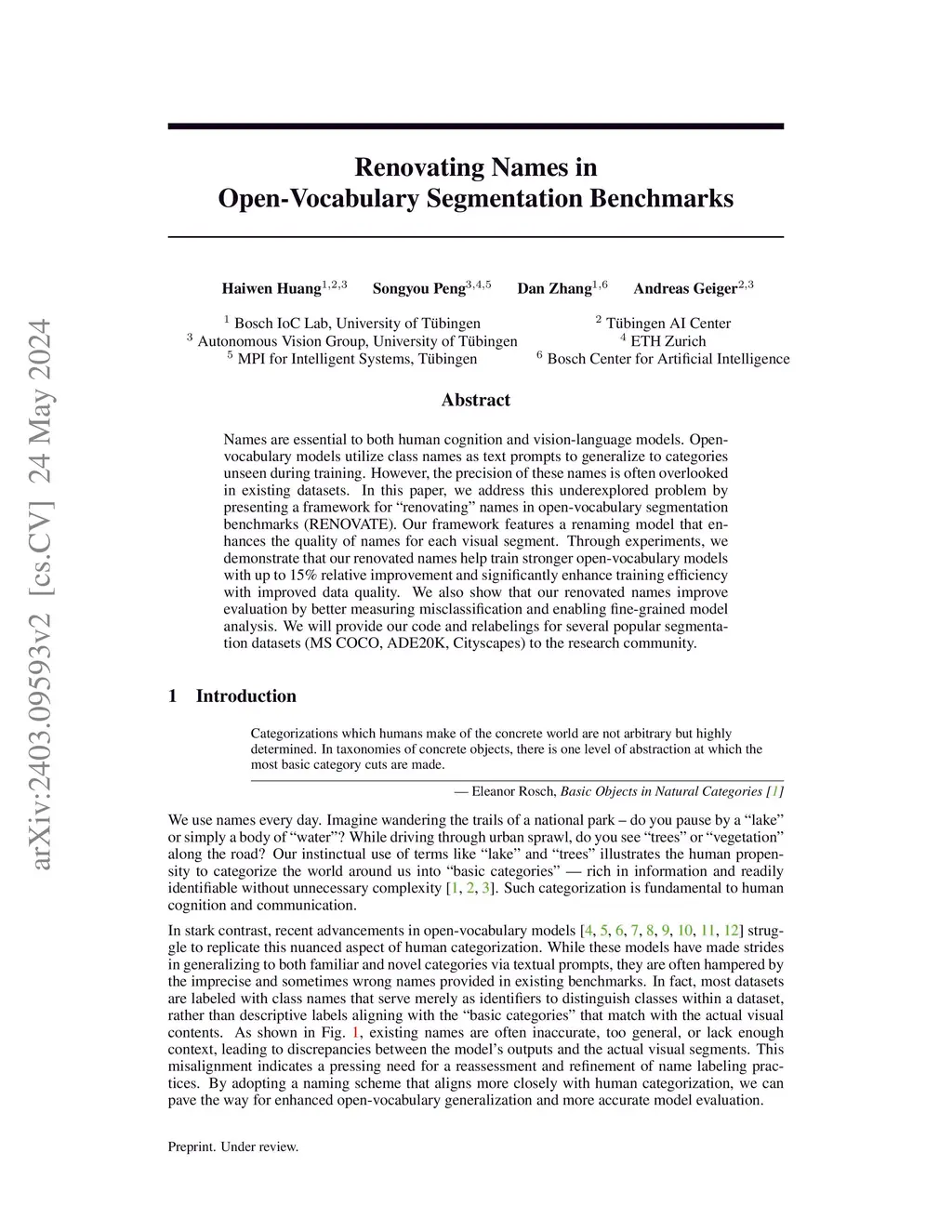 Names are essential to both human cognition and vision-language models. Open-vocabulary models utilize class names as text prompts to generalize to categories unseen during training. However, the precision of these names is often overlooked in existing datasets. In this paper, we address this underexplored problem by presenting a framework for "renovating" names in open-vocabulary segmentation benchmarks (RENOVATE). Our framework features a renaming model that enhances the quality of names for each visual segment. Through experiments, we demonstrate that our renovated names help train stronger open-vocabulary models with up to 15% relative improvement and significantly enhance training efficiency with improved data quality. We also show that our renovated names improve evaluation by better measuring misclassification and enabling fine-grained model analysis. We will provide our code and relabelings for several popular segmentation datasets (MS COCO, ADE20K, Cityscapes) to the research community.
