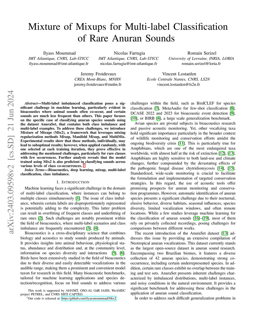 Mixture of Mixups for Multi-label Classification of Rare Anuran Sounds