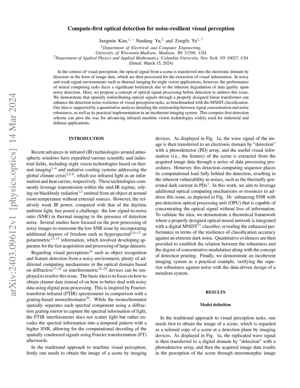 In the context of visual perception, the optical signal from a scene is transferred into the electronic domain by detectors in the form of image data, which are then processed for the extraction of visual information. In noisy and weak-signal environments such as thermal imaging for night vision applications, however, the performance of neural computing tasks faces a significant bottleneck due to the inherent degradation of data quality upon noisy detection. Here, we propose a concept of optical signal processing before detection to address this issue. We demonstrate that spatially redistributing optical signals through a properly designed linear transformer can enhance the detection noise resilience of visual perception tasks, as benchmarked with the MNIST classification. Our idea is supported by a quantitative analysis detailing the relationship between signal concentration and noise robustness, as well as its practical implementation in an incoherent imaging system. This compute-first detection scheme can pave the way for advancing infrared machine vision technologies widely used for industrial and defense applications.