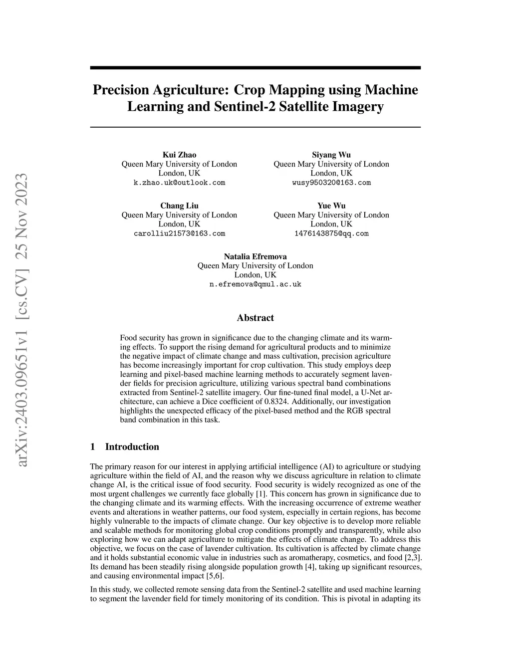 Food security has grown in significance due to the changing climate and its warming effects. To support the rising demand for agricultural products and to minimize the negative impact of climate change and mass cultivation, precision agriculture has become increasingly important for crop cultivation. This study employs deep learning and pixel-based machine learning methods to accurately segment lavender fields for precision agriculture, utilizing various spectral band combinations extracted from Sentinel-2 satellite imagery. Our fine-tuned final model, a U-Net architecture, can achieve a Dice coefficient of 0.8324. Additionally, our investigation highlights the unexpected efficacy of the pixel-based method and the RGB spectral band combination in this task.