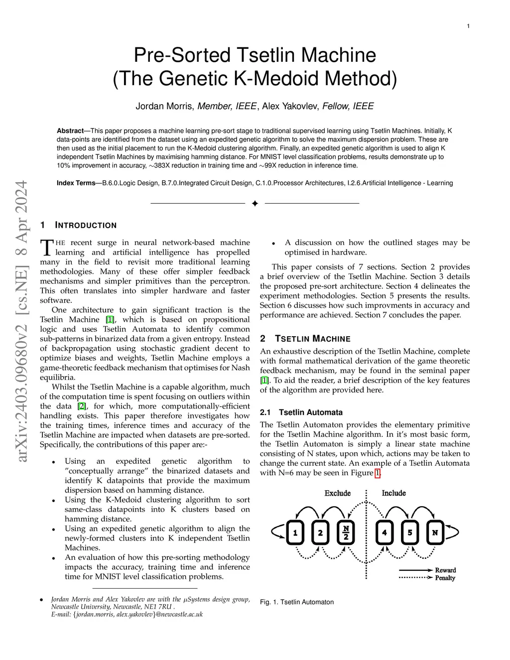 This paper proposes a machine learning pre-sort stage to traditional supervised learning using Tsetlin Machines. Initially, N data-points are identified from the dataset using an expedited genetic algorithm to solve the maximum dispersion problem. These are then used as the initial placement to run the K-Medoid clustering algorithm. Finally, an expedited genetic algorithm is used to align N independent Tsetlin Machines by maximising hamming distance. For MNIST level classification problems, results demonstrate up to 10% improvement in accuracy, approx. 383X reduction in training time and approx. 86X reduction in inference time.