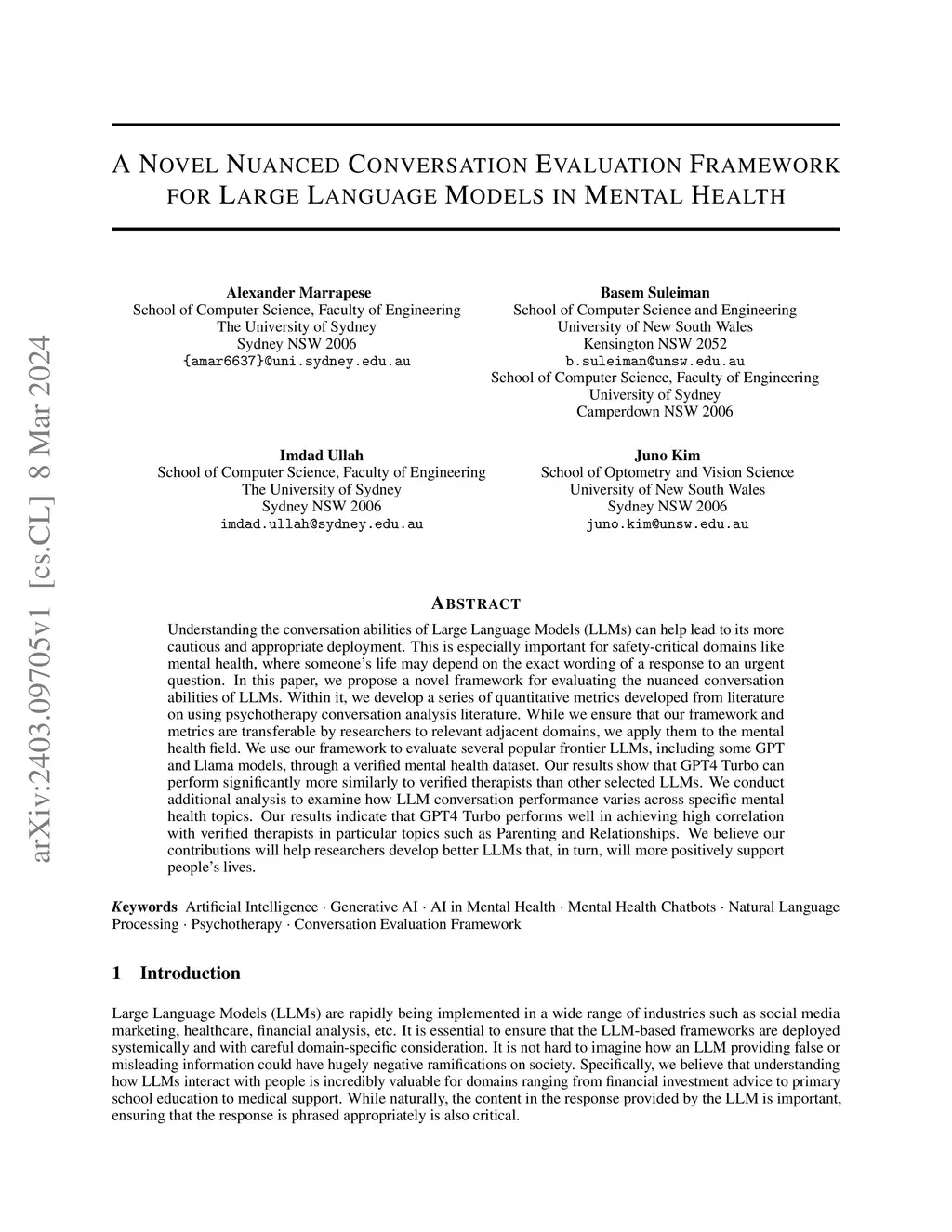Understanding the conversation abilities of Large Language Models (LLMs) can help lead to its more cautious and appropriate deployment. This is especially important for safety-critical domains like mental health, where someone's life may depend on the exact wording of a response to an urgent question. In this paper, we propose a novel framework for evaluating the nuanced conversation abilities of LLMs. Within it, we develop a series of quantitative metrics developed from literature on using psychotherapy conversation analysis literature. While we ensure that our framework and metrics are transferable by researchers to relevant adjacent domains, we apply them to the mental health field. We use our framework to evaluate several popular frontier LLMs, including some GPT and Llama models, through a verified mental health dataset. Our results show that GPT4 Turbo can perform significantly more similarly to verified therapists than other selected LLMs. We conduct additional analysis to examine how LLM conversation performance varies across specific mental health topics. Our results indicate that GPT4 Turbo performs well in achieving high correlation with verified therapists in particular topics such as Parenting and Relationships. We believe our contributions will help researchers develop better LLMs that, in turn, will more positively support people's lives.