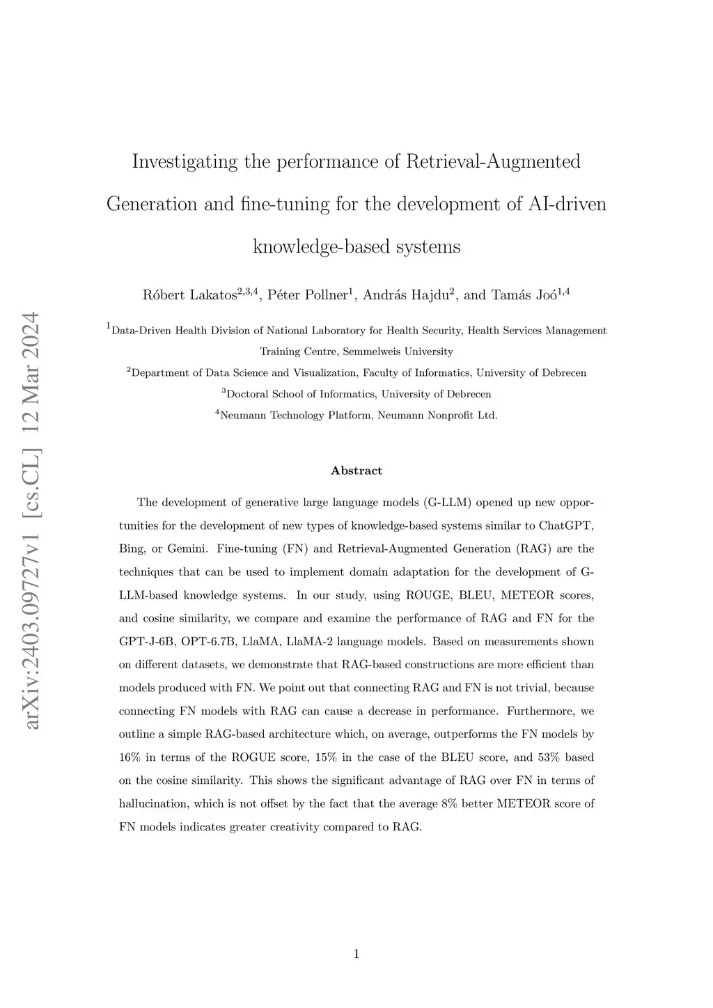 The development of generative large language models (G-LLM) opened up new opportunities for the development of new types of knowledge-based systems similar to ChatGPT, Bing, or Gemini. Fine-tuning (FN) and Retrieval-Augmented Generation (RAG) are the techniques that can be used to implement domain adaptation for the development of G-LLM-based knowledge systems. In our study, using ROUGE, BLEU, METEOR scores, and cosine similarity, we compare and examine the performance of RAG and FN for the GPT-J-6B, OPT-6.7B, LlaMA, LlaMA-2 language models. Based on measurements shown on different datasets, we demonstrate that RAG-based constructions are more efficient than models produced with FN. We point out that connecting RAG and FN is not trivial, because connecting FN models with RAG can cause a decrease in performance. Furthermore, we outline a simple RAG-based architecture which, on average, outperforms the FN models by 16% in terms of the ROGUE score, 15% in the case of the BLEU score, and 53% based on the cosine similarity. This shows the significant advantage of RAG over FN in terms of hallucination, which is not offset by the fact that the average 8% better METEOR score of FN models indicates greater creativity compared to RAG.