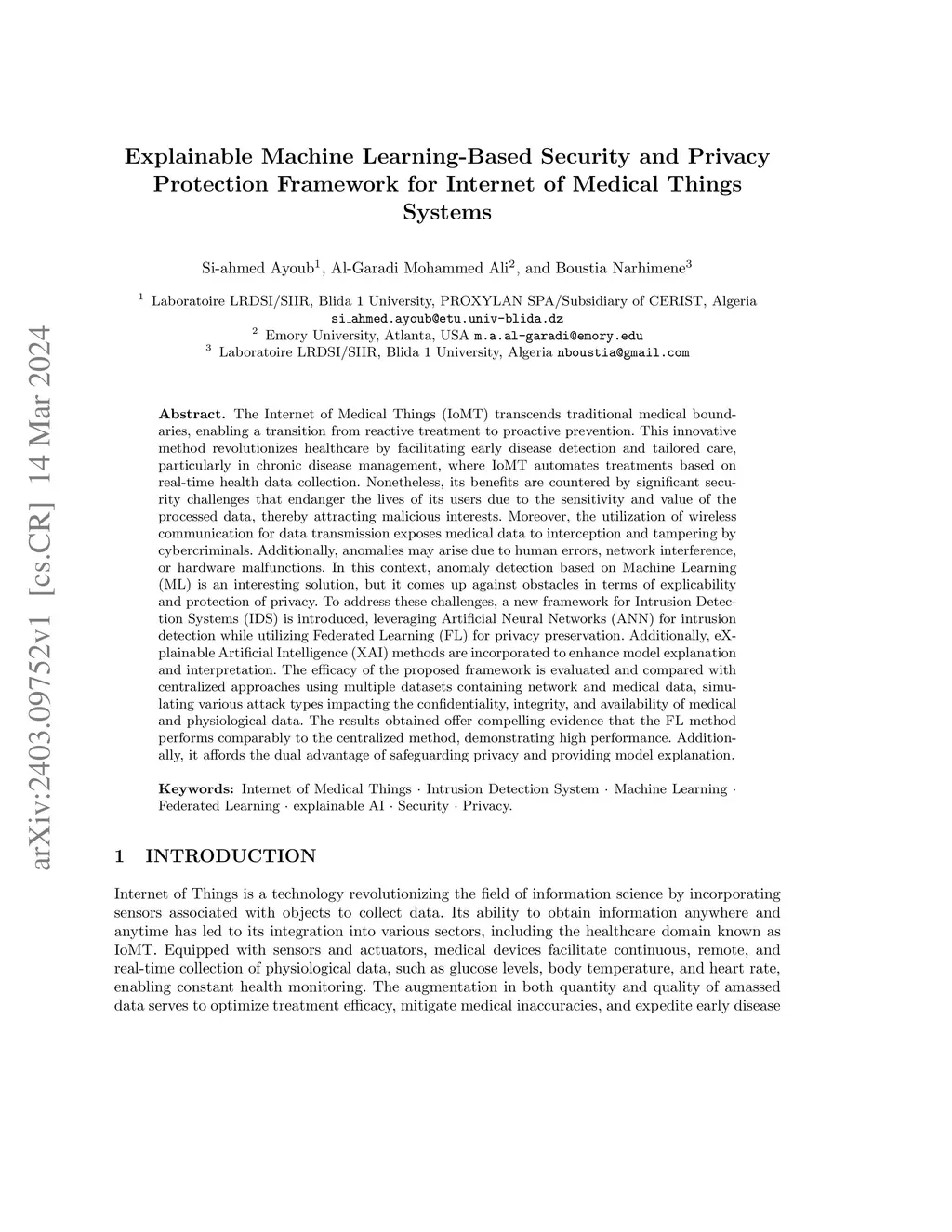The Internet of Medical Things transcends traditional medical boundaries, enabling a transition from reactive treatment to proactive prevention. This innovative method revolutionizes healthcare by facilitating early disease detection and tailored care, particularly in chronic disease management, where IoMT automates treatments based on real-time health data collection. Nonetheless, its benefits are countered by significant security challenges that endanger the lives of its users due to the sensitivity and value of the processed data, thereby attracting malicious interests. Moreover, the utilization of wireless communication for data transmission exposes medical data to interception and tampering by cybercriminals. Additionally, anomalies may arise due to human error, network interference, or hardware malfunctions. In this context, anomaly detection based on Machine Learning (ML) is an interesting solution, but it comes up against obstacles in terms of explicability and privacy protection. To address these challenges, a new framework for Intrusion Detection Systems is introduced, leveraging Artificial Neural Networks for intrusion detection while utilizing Federated Learning for privacy preservation. Additionally, eXplainable Artificial Intelligence methods are incorporated to enhance model explanation and interpretation. The efficacy of the proposed framework is evaluated and compared with centralized approaches using multiple datasets containing network and medical data, simulating various attack types impacting the confidentiality, integrity, and availability of medical and physiological data. The results offer compelling evidence that the FL method performs comparably to the centralized method, demonstrating high performance. Additionally, it affords the dual advantage of safeguarding privacy and providing model explanation while adhering to ethical principles.