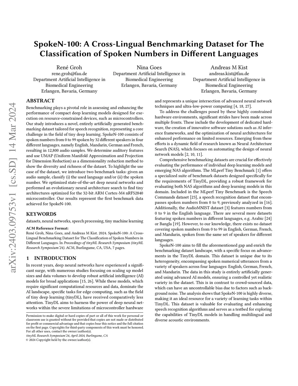 Benchmarking plays a pivotal role in assessing and enhancing the performance of compact deep learning models designed for execution on resource-constrained devices, such as microcontrollers. Our study introduces a novel, entirely artificially generated benchmarking dataset tailored for speech recognition, representing a core challenge in the field of tiny deep learning. SpokeN-100 consists of spoken numbers from 0 to 99 spoken by 32 different speakers in four different languages, namely English, Mandarin, German and French, resulting in 12,800 audio samples. We determine auditory features and use UMAP (Uniform Manifold Approximation and Projection for Dimension Reduction) as a dimensionality reduction method to show the diversity and richness of the dataset. To highlight the use case of the dataset, we introduce two benchmark tasks: given an audio sample, classify (i) the used language and/or (ii) the spoken number. We optimized state-of-the-art deep neural networks and performed an evolutionary neural architecture search to find tiny architectures optimized for the 32-bit ARM Cortex-M4 nRF52840 microcontroller. Our results represent the first benchmark data achieved for SpokeN-100.