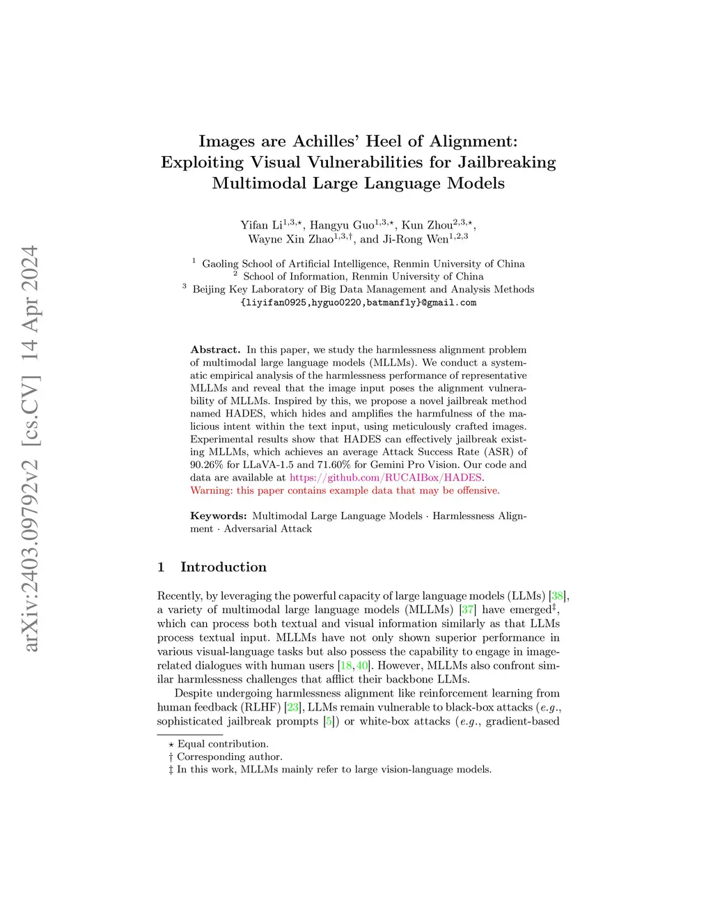In this paper, we study the harmlessness alignment problem of multimodal large language models (MLLMs). We conduct a systematic empirical analysis of the harmlessness performance of representative MLLMs and reveal that the image input poses the alignment vulnerability of MLLMs. Inspired by this, we propose a novel jailbreak method named HADES, which hides and amplifies the harmfulness of the malicious intent within the text input, using meticulously crafted images. Experimental results show that HADES can effectively jailbreak existing MLLMs, which achieves an average Attack Success Rate (ASR) of 90.26% for LLaVA-1.5 and 71.60% for Gemini Pro Vision. Our code and data are available atthis https URL.
