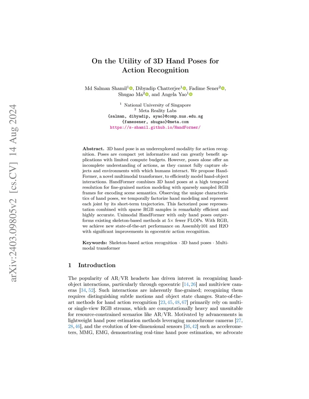 3D hand poses are an under-explored modality for action recognition. Poses are compact yet informative and can greatly benefit applications with limited compute budgets. However, poses alone offer an incomplete understanding of actions, as they cannot fully capture objects and environments with which humans interact. To efficiently model hand-object interactions, we propose HandFormer, a novel multimodal transformer. HandFormer combines 3D hand poses at a high temporal resolution for fine-grained motion modeling with sparsely sampled RGB frames for encoding scene semantics. Observing the unique characteristics of hand poses, we temporally factorize hand modeling and represent each joint by its short-term trajectories. This factorized pose representation combined with sparse RGB samples is remarkably efficient and achieves high accuracy. Unimodal HandFormer with only hand poses outperforms existing skeleton-based methods at 5x fewer FLOPs. With RGB, we achieve new state-of-the-art performance on Assembly101 and H2O with significant improvements in egocentric action recognition.