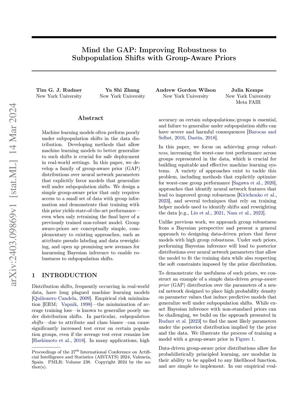 Machine learning models often perform poorly under subpopulation shifts in the data distribution. Developing methods that allow machine learning models to better generalize to such shifts is crucial for safe deployment in real-world settings. In this paper, we develop a family of group-aware prior (GAP) distributions over neural network parameters that explicitly favor models that generalize well under subpopulation shifts. We design a simple group-aware prior that only requires access to a small set of data with group information and demonstrate that training with this prior yields state-of-the-art performance -- even when only retraining the final layer of a previously trained non-robust model. Group aware-priors are conceptually simple, complementary to existing approaches, such as attribute pseudo labeling and data reweighting, and open up promising new avenues for harnessing Bayesian inference to enable robustness to subpopulation shifts.