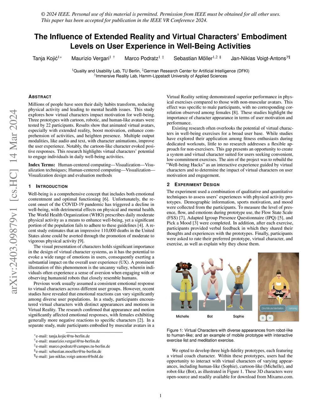 Millions of people have seen their daily habits transform, reducing physical activity and leading to mental health issues. This study explores how virtual characters impact motivation for well-being. Three prototypes with cartoon, robotic, and human-like avatars were tested by 22 participants. Results show that animated virtual avatars, especially with extended reality, boost motivation, enhance comprehension of activities, and heighten presence. Multiple output modalities, like audio and text, with character animations, improve the user experience. Notably, the cartoon-like character evoked positive responses. This research highlights virtual characters' potential to engage individuals in daily well-being activities.