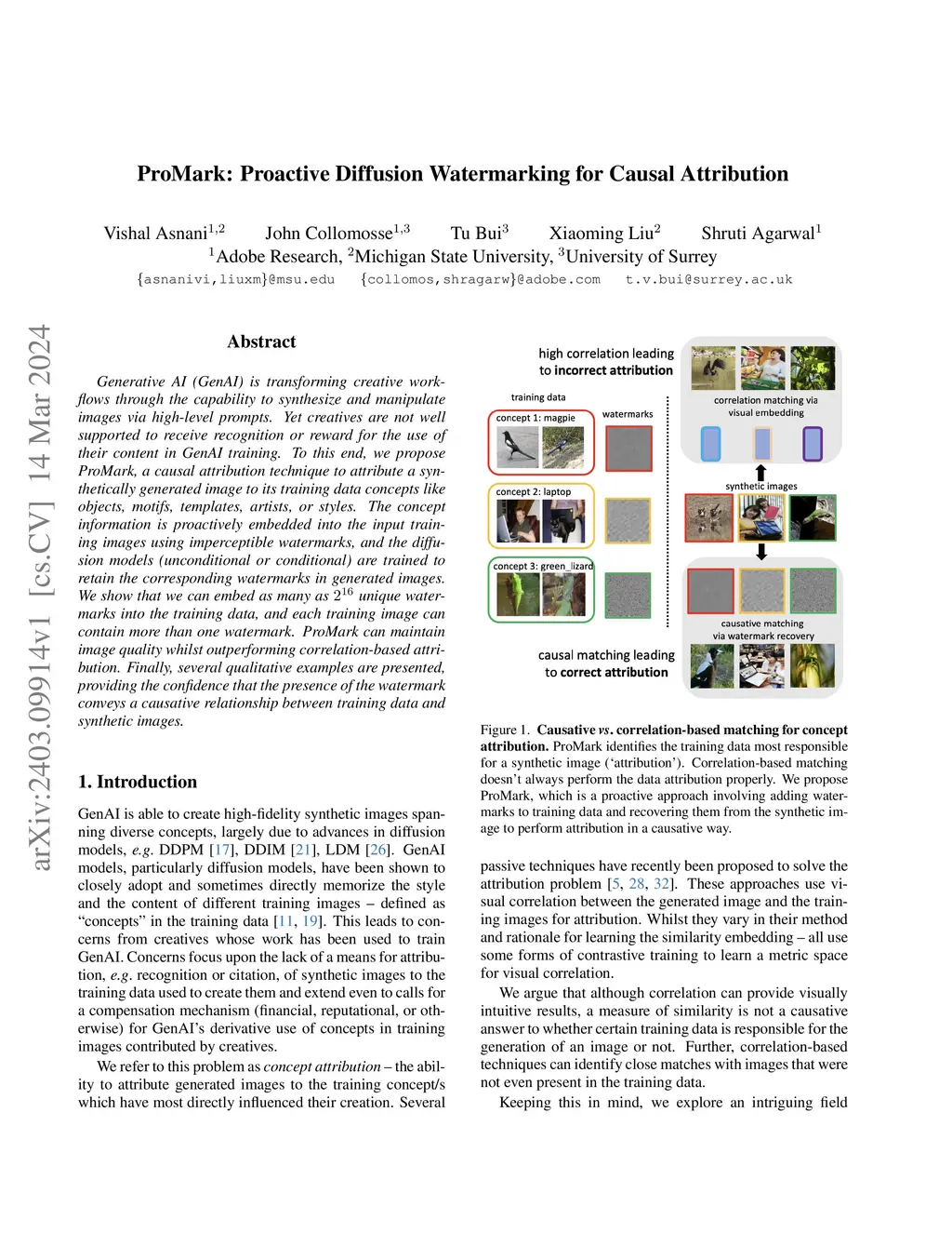 Generative AI (GenAI) is transforming creative workflows through the capability to synthesize and manipulate images via high-level prompts. Yet creatives are not well supported to receive recognition or reward for the use of their content in GenAI training. To this end, we propose ProMark, a causal attribution technique to attribute a synthetically generated image to its training data concepts like objects, motifs, templates, artists, or styles. The concept information is proactively embedded into the input training images using imperceptible watermarks, and the diffusion models (unconditional or conditional) are trained to retain the corresponding watermarks in generated images. We show that we can embed as many as unique watermarks into the training data, and each training image can contain more than one watermark. ProMark can maintain image quality whilst outperforming correlation-based attribution. Finally, several qualitative examples are presented, providing the confidence that the presence of the watermark conveys a causative relationship between training data and synthetic images.