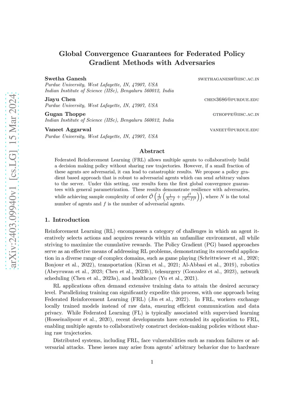 Federated Reinforcement Learning (FRL) allows multiple agents to collaboratively build a decision making policy without sharing raw trajectories. However, if a small fraction of these agents are adversarial, it can lead to catastrophic results. We propose a policy gradient based approach that is robust to adversarial agents which can send arbitrary values to the server. Under this setting, our results form the first global convergence guarantees with general parametrization. These results demonstrate resilience with adversaries, while achieving sample complexity of order , where is the total number of agents and is the number of adversarial agents.