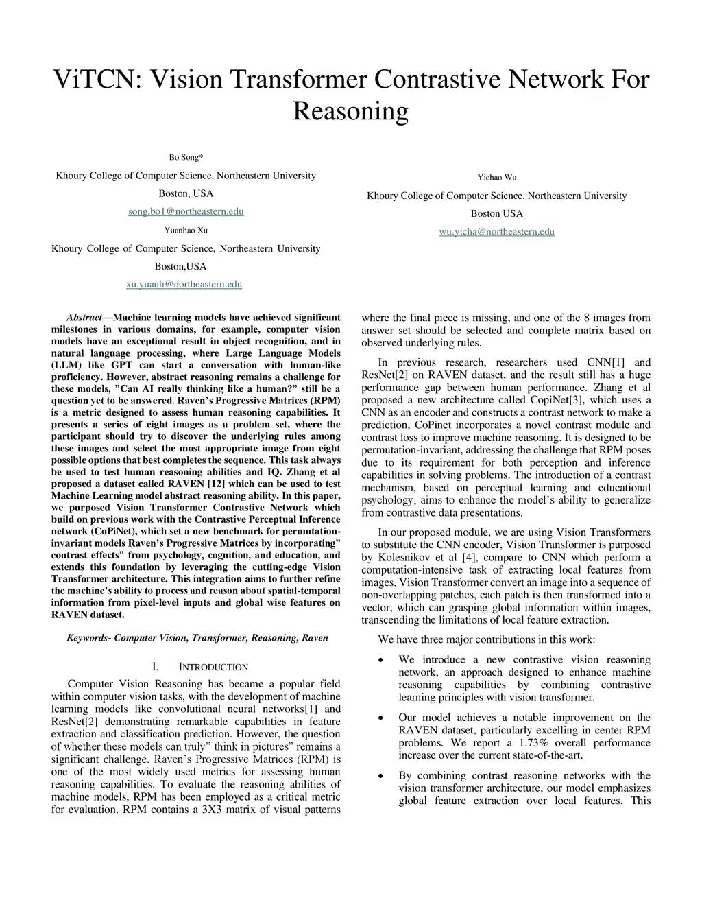 ViTCN: Vision Transformer Contrastive Network For Reasoning