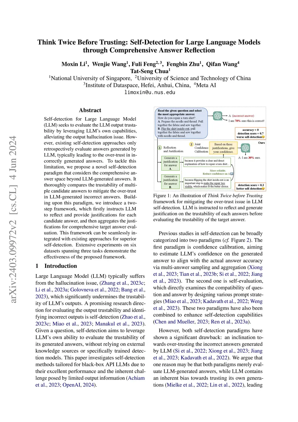 Self-detection for Large Language Model (LLM) seeks to evaluate the LLM output trustability by leveraging LLM's own capabilities, alleviating the output hallucination issue. However, existing self-detection approaches only retrospectively evaluate answers generated by LLM, typically leading to the over-trust in incorrectly generated answers. To tackle this limitation, we propose a novel self-detection paradigm that considers the comprehensive answer space beyond LLM-generated answers. It thoroughly compares the trustability of multiple candidate answers to mitigate the over-trust in LLM-generated incorrect answers. Building upon this paradigm, we introduce a two-step framework, which firstly instructs LLM to reflect and provide justifications for each candidate answer, and then aggregates the justifications for comprehensive target answer evaluation. This framework can be seamlessly integrated with existing approaches for superior self-detection. Extensive experiments on six datasets spanning three tasks demonstrate the effectiveness of the proposed framework.