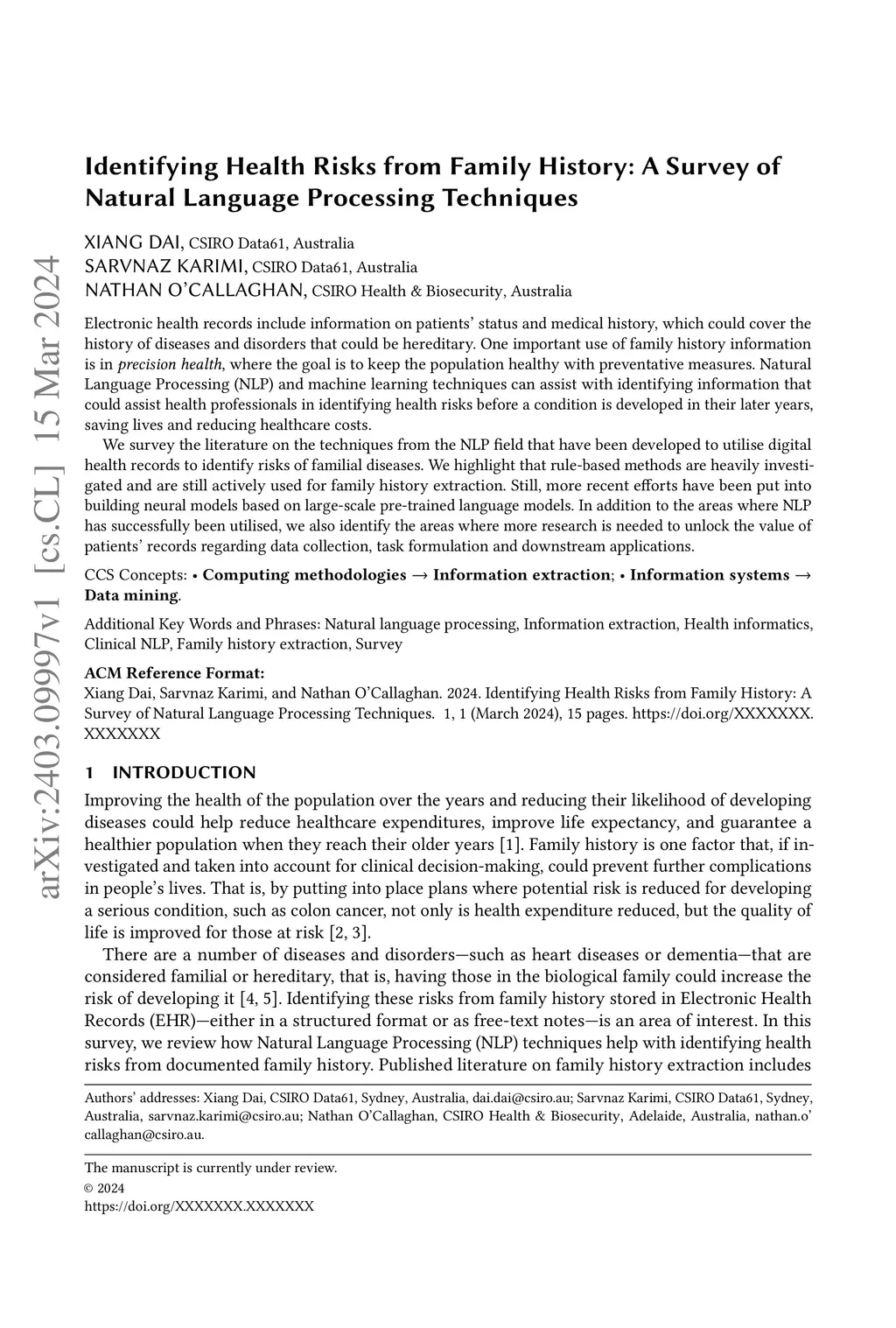 Electronic health records include information on patients' status and medical history, which could cover the history of diseases and disorders that could be hereditary. One important use of family history information is in precision health, where the goal is to keep the population healthy with preventative measures. Natural Language Processing (NLP) and machine learning techniques can assist with identifying information that could assist health professionals in identifying health risks before a condition is developed in their later years, saving lives and reducing healthcare costs. We survey the literature on the techniques from the NLP field that have been developed to utilise digital health records to identify risks of familial diseases. We highlight that rule-based methods are heavily investigated and are still actively used for family history extraction. Still, more recent efforts have been put into building neural models based on large-scale pre-trained language models. In addition to the areas where NLP has successfully been utilised, we also identify the areas where more research is needed to unlock the value of patients' records regarding data collection, task formulation and downstream applications.