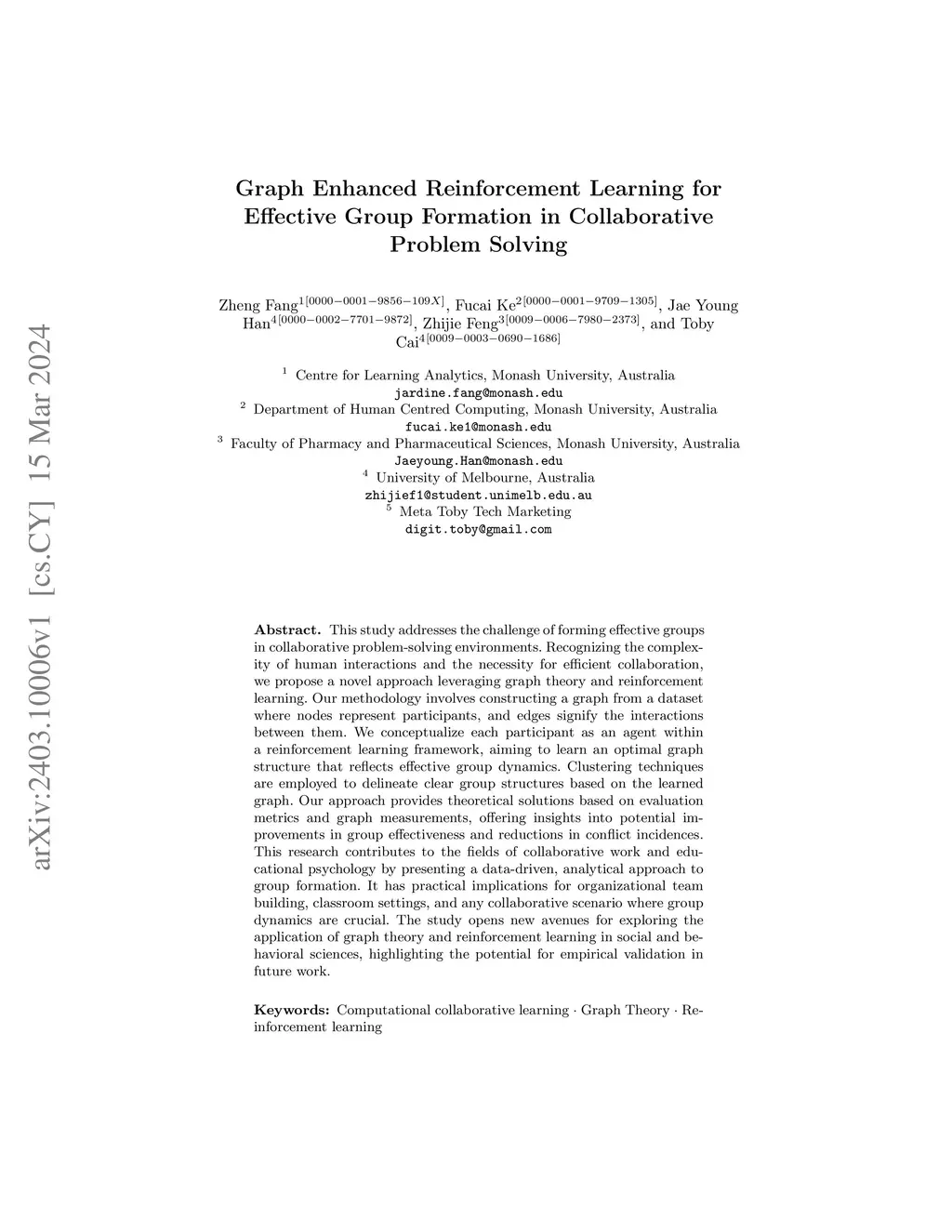 This study addresses the challenge of forming effective groups in collaborative problem-solving environments. Recognizing the complexity of human interactions and the necessity for efficient collaboration, we propose a novel approach leveraging graph theory and reinforcement learning. Our methodology involves constructing a graph from a dataset where nodes represent participants, and edges signify the interactions between them. We conceptualize each participant as an agent within a reinforcement learning framework, aiming to learn an optimal graph structure that reflects effective group dynamics. Clustering techniques are employed to delineate clear group structures based on the learned graph. Our approach provides theoretical solutions based on evaluation metrics and graph measurements, offering insights into potential improvements in group effectiveness and reductions in conflict incidences. This research contributes to the fields of collaborative work and educational psychology by presenting a data-driven, analytical approach to group formation. It has practical implications for organizational team building, classroom settings, and any collaborative scenario where group dynamics are crucial. The study opens new avenues for exploring the application of graph theory and reinforcement learning in social and behavioral sciences, highlighting the potential for empirical validation in future work.