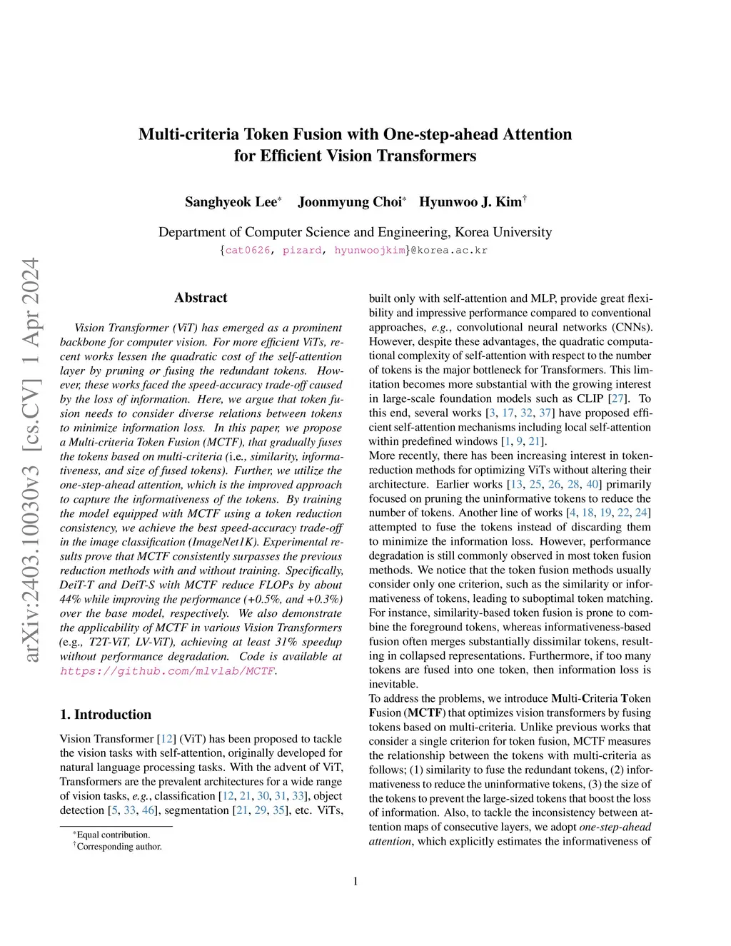 Multi-criteria Token Fusion with One-step-ahead Attention for Efficient