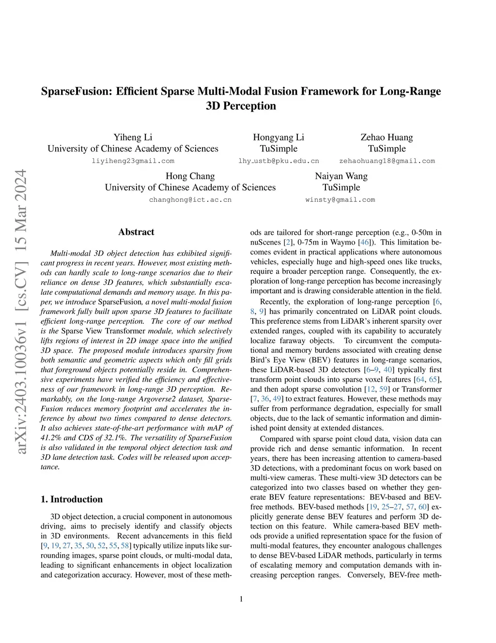 Multi-modal 3D object detection has exhibited significant progress in recent years. However, most existing methods can hardly scale to long-range scenarios due to their reliance on dense 3D features, which substantially escalate computational demands and memory usage. In this paper, we introduce SparseFusion, a novel multi-modal fusion framework fully built upon sparse 3D features to facilitate efficient long-range perception. The core of our method is the Sparse View Transformer module, which selectively lifts regions of interest in 2D image space into the unified 3D space. The proposed module introduces sparsity from both semantic and geometric aspects which only fill grids that foreground objects potentially reside in. Comprehensive experiments have verified the efficiency and effectiveness of our framework in long-range 3D perception. Remarkably, on the long-range Argoverse2 dataset, SparseFusion reduces memory footprint and accelerates the inference by about two times compared to dense detectors. It also achieves state-of-the-art performance with mAP of 41.2% and CDS of 32.1%. The versatility of SparseFusion is also validated in the temporal object detection task and 3D lane detection task. Codes will be released upon acceptance.