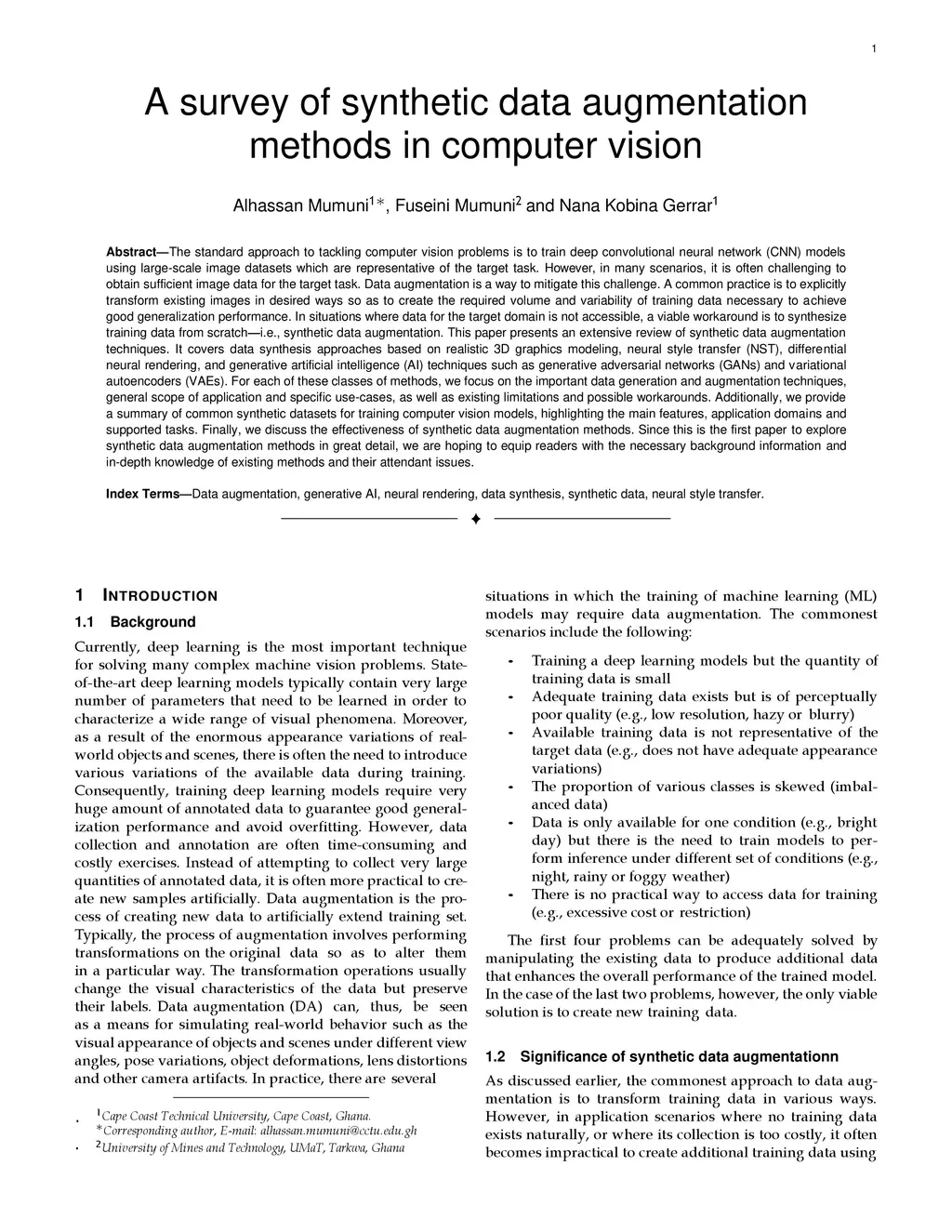 The standard approach to tackling computer vision problems is to train deep convolutional neural network (CNN) models using large-scale image datasets which are representative of the target task. However, in many scenarios, it is often challenging to obtain sufficient image data for the target task. Data augmentation is a way to mitigate this challenge. A common practice is to explicitly transform existing images in desired ways so as to create the required volume and variability of training data necessary to achieve good generalization performance. In situations where data for the target domain is not accessible, a viable workaround is to synthesize training data from scratch--i.e., synthetic data augmentation. This paper presents an extensive review of synthetic data augmentation techniques. It covers data synthesis approaches based on realistic 3D graphics modeling, neural style transfer (NST), differential neural rendering, and generative artificial intelligence (AI) techniques such as generative adversarial networks (GANs) and variational autoencoders (VAEs). For each of these classes of methods, we focus on the important data generation and augmentation techniques, general scope of application and specific use-cases, as well as existing limitations and possible workarounds. Additionally, we provide a summary of common synthetic datasets for training computer vision models, highlighting the main features, application domains and supported tasks. Finally, we discuss the effectiveness of synthetic data augmentation methods. Since this is the first paper to explore synthetic data augmentation methods in great detail, we are hoping to equip readers with the necessary background information and in-depth knowledge of existing methods and their attendant issues.