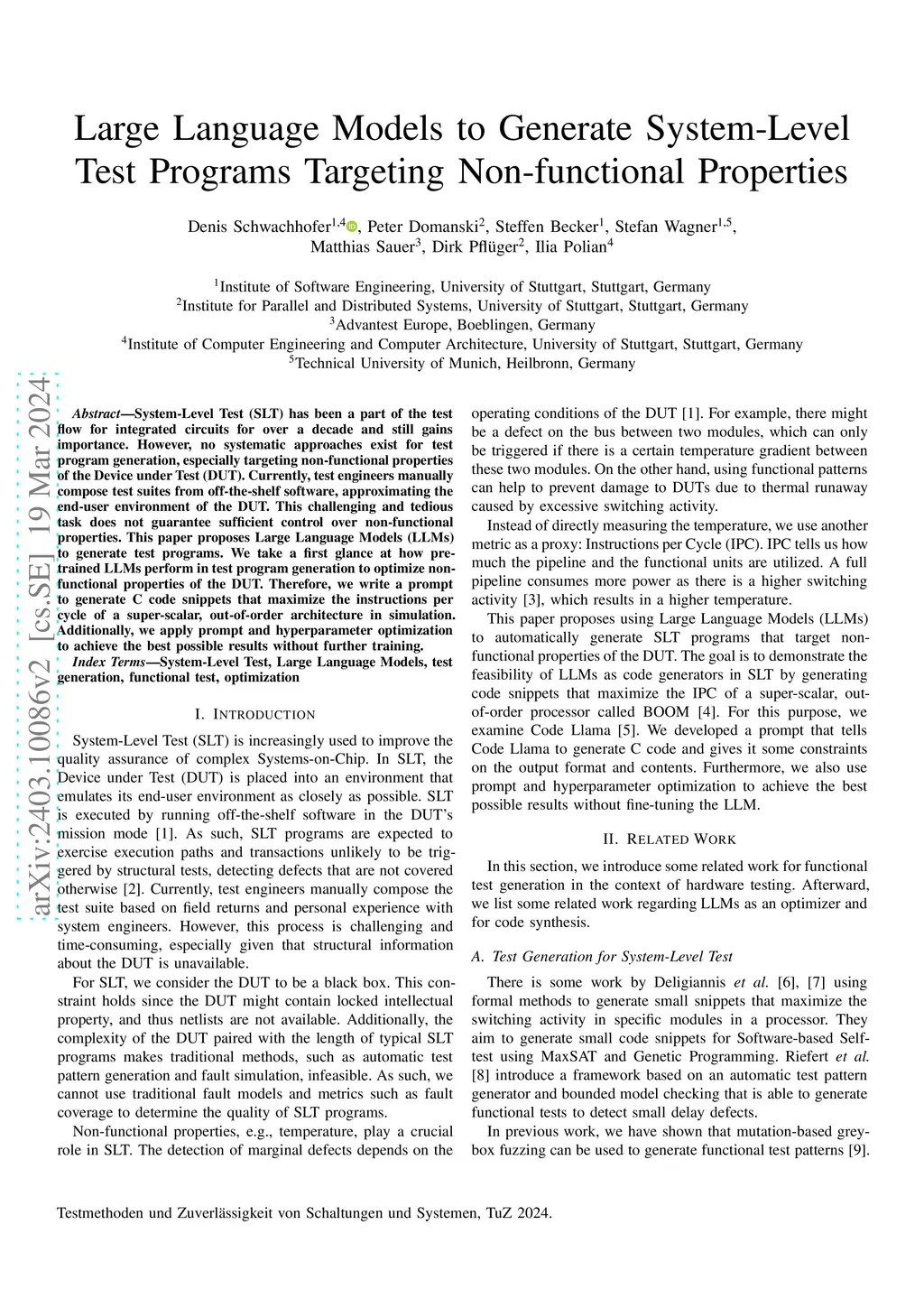 System-Level Test (SLT) has been a part of the test flow for integrated circuits for over a decade and still gains importance. However, no systematic approaches exist for test program generation, especially targeting non-functional properties of the Device under Test (DUT). Currently, test engineers manually compose test suites from off-the-shelf software, approximating the end-user environment of the DUT. This is a challenging and tedious task that does not guarantee sufficient control over non-functional properties. This paper proposes Large Language Models (LLMs) to generate test programs. We take a first glance at how pre-trained LLMs perform in test program generation to optimize non-functional properties of the DUT. Therefore, we write a prompt to generate C code snippets that maximize the instructions per cycle of a super-scalar, out-of-order architecture in simulation. Additionally, we apply prompt and hyperparameter optimization to achieve the best possible results without further training.