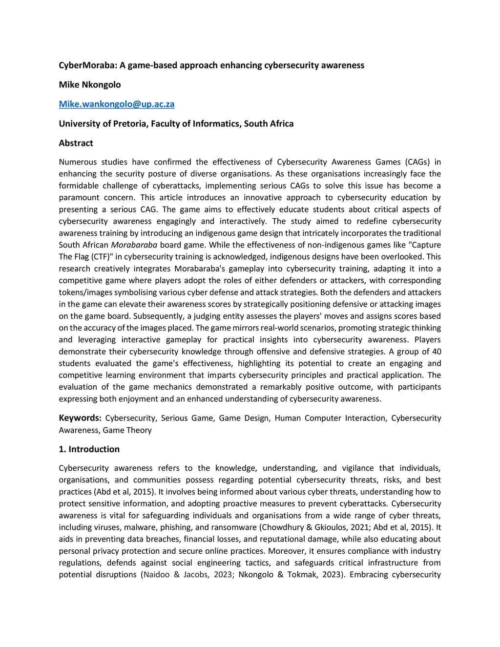 Numerous studies confirm Cybersecurity Awareness Games (CAGs) effectively bolster organisational security against cyberattacks. This article introduces a serious CAG, integrating the traditional South African Morabaraba board game into cybersecurity education. Players adopt roles of defenders or attackers, strategically placing tokens to enhance awareness. Evaluation shows positive outcomes, enhancing understanding and enjoyment among participants.