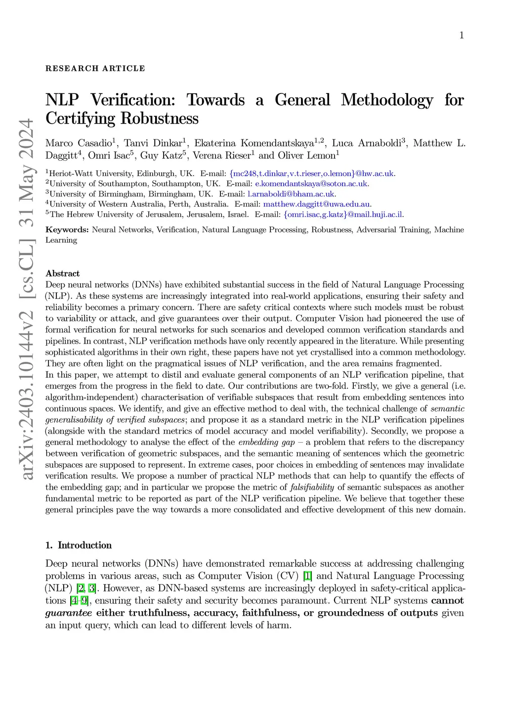 Machine Learning (ML) has exhibited substantial success in the field of Natural Language Processing (NLP). For example large language models have empirically proven to be capable of producing text of high complexity and cohesion. However, they are prone to inaccuracies and hallucinations. As these systems are increasingly integrated into real-world applications, ensuring their safety and reliability becomes a primary concern. There are safety critical contexts where such models must be robust to variability or attack, and give guarantees over their output. Computer Vision had pioneered the use of formal verification of neural networks for such scenarios and developed common verification standards and pipelines, leveraging precise formal reasoning about geometric properties of data manifolds. In contrast, NLP verification methods have only recently appeared in the literature. While presenting sophisticated algorithms, these papers have not yet crystallised into a common methodology. They are often light on the pragmatical issues of NLP verification and the area remains fragmented. In this paper, we attempt to distil and evaluate general components of an NLP verification pipeline, that emerges from the progress in the field to date. Our contributions are two-fold. Firstly, we propose a general methodology to analyse the effect of the embedding gap, a problem that refers to the discrepancy between verification of geometric subspaces and the semantic meaning of sentences, which the geometric subspaces are supposed to represent. We propose a number of practical NLP methods that can help to quantify the effects of the embedding gap. Secondly, we give a general method for training and verification of neural networks that leverages a more precise geometric estimation of semantic similarity of sentences in the embedding space and helps to overcome the effects of the embedding gap in practice.