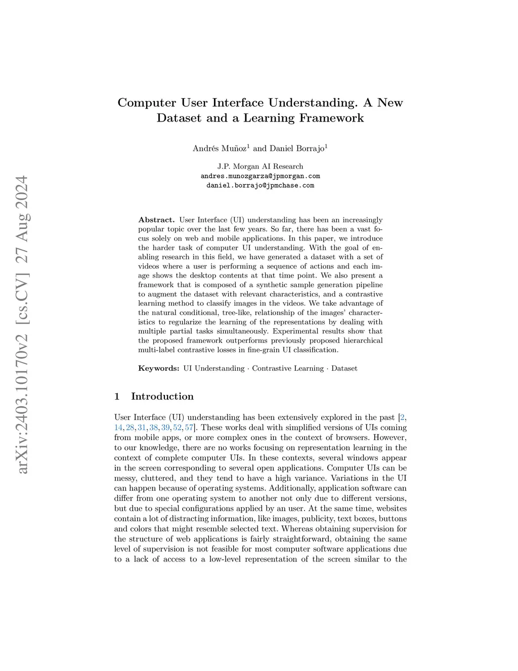 User Interface (UI) understanding has been an increasingly popular topic over the last few years. So far, there has been a vast focus solely on web and mobile applications. In this paper, we introduce the harder task of computer UI understanding. With the goal of enabling research in this field, we have generated a dataset with a set of videos where a user is performing a sequence of actions and each image shows the desktop contents at that time point. We also present a framework that is composed of a synthetic sample generation pipeline to augment the dataset with relevant characteristics, and a contrastive learning method to classify images in the videos. We take advantage of the natural conditional, tree-like, relationship of the images' characteristics to regularize the learning of the representations by dealing with multiple partial tasks simultaneously. Experimental results show that the proposed framework outperforms previously proposed hierarchical multi-label contrastive losses in fine-grain UI classification.