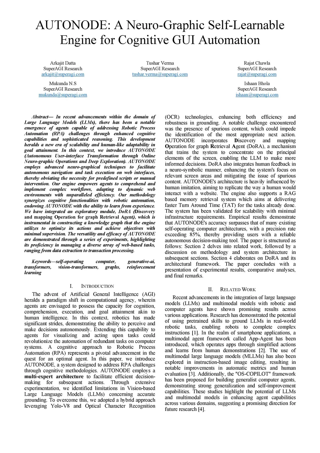 In recent advancements within the domain of Large Language Models (LLMs), there has been a notable emergence of agents capable of addressing Robotic Process Automation (RPA) challenges through enhanced cognitive capabilities and sophisticated reasoning. This development heralds a new era of scalability and human-like adaptability in goal attainment. In this context, we introduce AUTONODE (Autonomous User-interface Transformation through Online Neuro-graphic Operations and Deep Exploration). AUTONODE employs advanced neuro-graphical techniques to facilitate autonomous navigation and task execution on web interfaces, thereby obviating the necessity for predefined scripts or manual intervention. Our engine empowers agents to comprehend and implement complex workflows, adapting to dynamic web environments with unparalleled efficiency. Our methodology synergizes cognitive functionalities with robotic automation, endowing AUTONODE with the ability to learn from experience. We have integrated an exploratory module, DoRA (Discovery and mapping Operation for graph Retrieval Agent), which is instrumental in constructing a knowledge graph that the engine utilizes to optimize its actions and achieve objectives with minimal supervision. The versatility and efficacy of AUTONODE are demonstrated through a series of experiments, highlighting its proficiency in managing a diverse array of web-based tasks, ranging from data extraction to transaction processing.