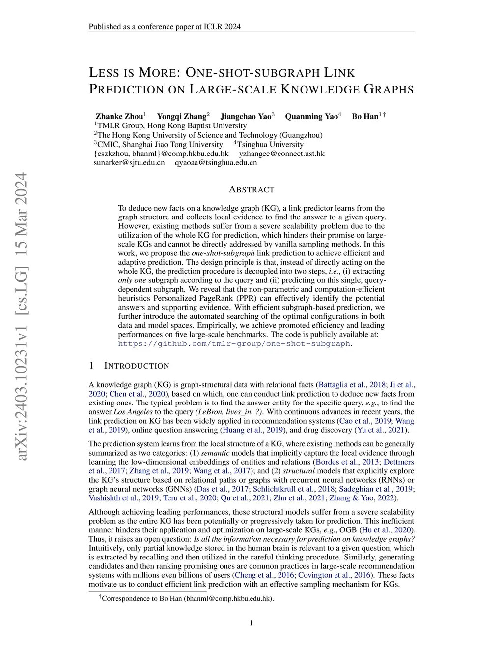 To deduce new facts on a knowledge graph (KG), a link predictor learns from the graph structure and collects local evidence to find the answer to a given query. However, existing methods suffer from a severe scalability problem due to the utilization of the whole KG for prediction, which hinders their promise on large scale KGs and cannot be directly addressed by vanilla sampling methods. In this work, we propose the one-shot-subgraph link prediction to achieve efficient and adaptive prediction. The design principle is that, instead of directly acting on the whole KG, the prediction procedure is decoupled into two steps, i.e., (i) extracting only one subgraph according to the query and (ii) predicting on this single, query dependent subgraph. We reveal that the non-parametric and computation-efficient heuristics Personalized PageRank (PPR) can effectively identify the potential answers and supporting evidence. With efficient subgraph-based prediction, we further introduce the automated searching of the optimal configurations in both data and model spaces. Empirically, we achieve promoted efficiency and leading performances on five large-scale benchmarks. The code is publicly available at:this https URL.