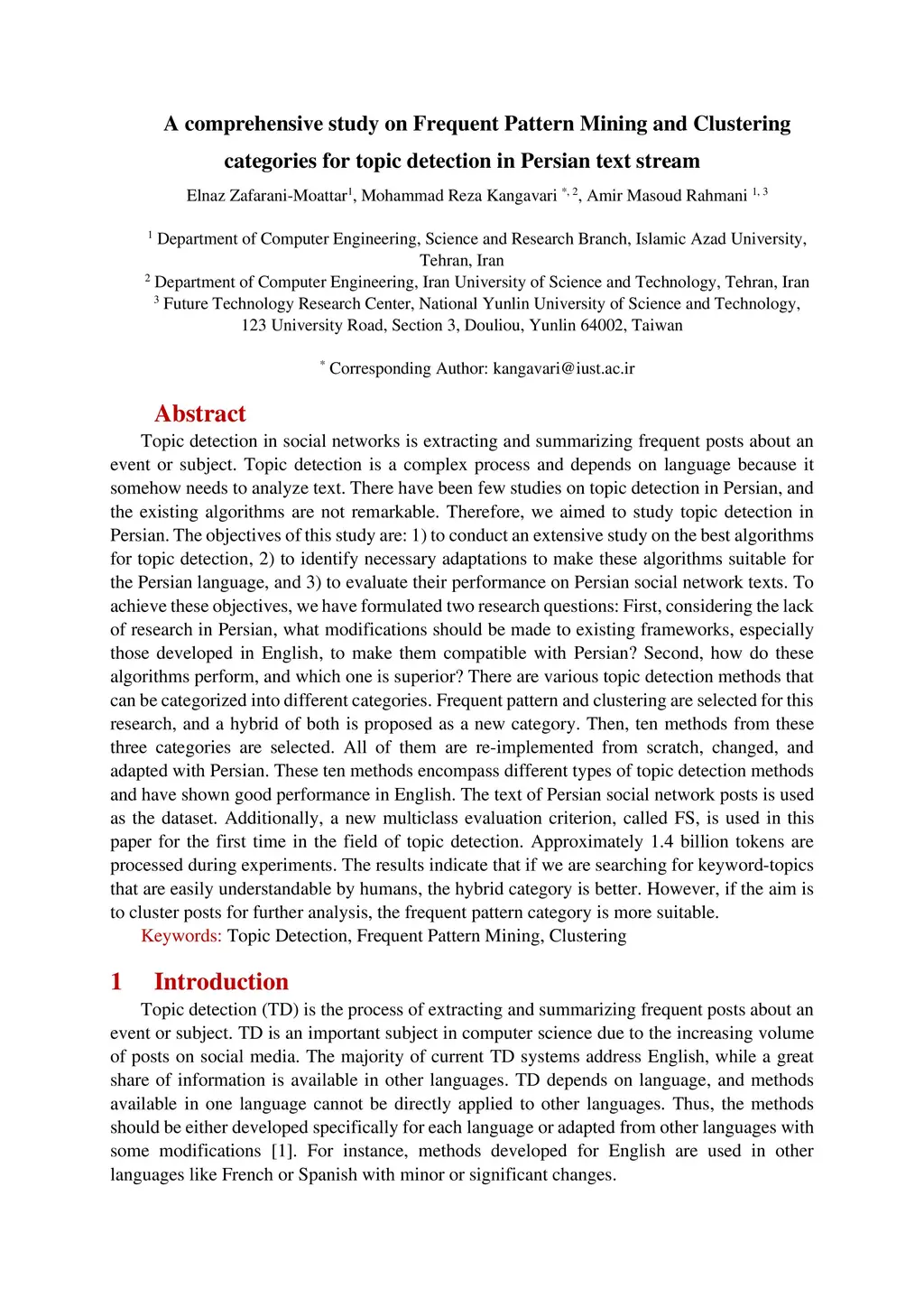 Topic detection is a complex process and depends on language because it somehow needs to analyze text. There have been few studies on topic detection in Persian, and the existing algorithms are not remarkable. Therefore, we aimed to study topic detection in Persian. The objectives of this study are: 1) to conduct an extensive study on the best algorithms for topic detection, 2) to identify necessary adaptations to make these algorithms suitable for the Persian language, and 3) to evaluate their performance on Persian social network texts. To achieve these objectives, we have formulated two research questions: First, considering the lack of research in Persian, what modifications should be made to existing frameworks, especially those developed in English, to make them compatible with Persian? Second, how do these algorithms perform, and which one is superior? There are various topic detection methods that can be categorized into different categories. Frequent pattern and clustering are selected for this research, and a hybrid of both is proposed as a new category. Then, ten methods from these three categories are selected. All of them are re-implemented from scratch, changed, and adapted with Persian. These ten methods encompass different types of topic detection methods and have shown good performance in English. The text of Persian social network posts is used as the dataset. Additionally, a new multiclass evaluation criterion, called FS, is used in this paper for the first time in the field of topic detection. Approximately 1.4 billion tokens are processed during experiments. The results indicate that if we are searching for keyword-topics that are easily understandable by humans, the hybrid category is better. However, if the aim is to cluster posts for further analysis, the frequent pattern category is more suitable.