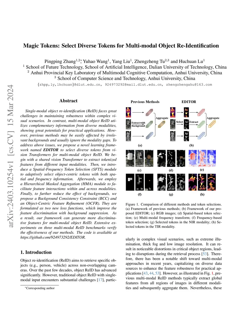 Single-modal object re-identification (ReID) faces great challenges in maintaining robustness within complex visual scenarios. In contrast, multi-modal object ReID utilizes complementary information from diverse modalities, showing great potentials for practical applications. However, previous methods may be easily affected by irrelevant backgrounds and usually ignore the modality gaps. To address above issues, we propose a novel learning framework named \textbf{EDITOR} to select diverse tokens from vision Transformers for multi-modal object ReID. We begin with a shared vision Transformer to extract tokenized features from different input modalities. Then, we introduce a Spatial-Frequency Token Selection (SFTS) module to adaptively select object-centric tokens with both spatial and frequency information. Afterwards, we employ a Hierarchical Masked Aggregation (HMA) module to facilitate feature interactions within and across modalities. Finally, to further reduce the effect of backgrounds, we propose a Background Consistency Constraint (BCC) and an Object-Centric Feature Refinement (OCFR). They are formulated as two new loss functions, which improve the feature discrimination with background suppression. As a result, our framework can generate more discriminative features for multi-modal object ReID. Extensive experiments on three multi-modal ReID benchmarks verify the effectiveness of our methods. The code is available at https://github.com/924973292/EDITOR.