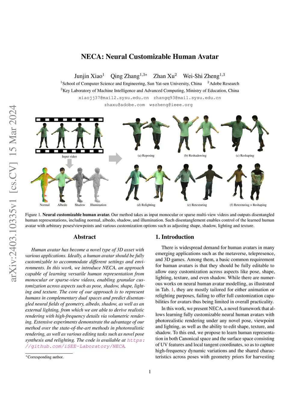 Human avatar has become a novel type of 3D asset with various applications. Ideally, a human avatar should be fully customizable to accommodate different settings and environments. In this work, we introduce NECA, an approach capable of learning versatile human representation from monocular or sparse-view videos, enabling granular customization across aspects such as pose, shadow, shape, lighting and texture. The core of our approach is to represent humans in complementary dual spaces and predict disentangled neural fields of geometry, albedo, shadow, as well as an external lighting, from which we are able to derive realistic rendering with high-frequency details via volumetric rendering. Extensive experiments demonstrate the advantage of our method over the state-of-the-art methods in photorealistic rendering, as well as various editing tasks such as novel pose synthesis and relighting. The code is available at https://github.com/iSEE-Laboratory/NECA.