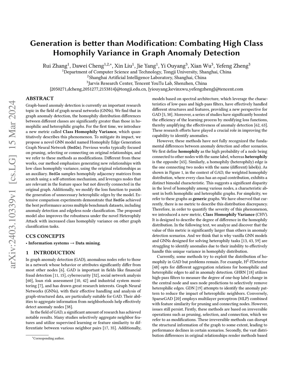Graph-based anomaly detection is currently an important research topic in the field of graph neural networks (GNNs). We find that in graph anomaly detection, the homophily distribution differences between different classes are significantly greater than those in homophilic and heterophilic graphs. For the first time, we introduce a new metric called Class Homophily Variance, which quantitatively describes this phenomenon. To mitigate its impact, we propose a novel GNN model named Homophily Edge Generation Graph Neural Network (HedGe). Previous works typically focused on pruning, selecting or connecting on original relationships, and we refer to these methods as modifications. Different from these works, our method emphasizes generating new relationships with low class homophily variance, using the original relationships as an auxiliary. HedGe samples homophily adjacency matrices from scratch using a self-attention mechanism, and leverages nodes that are relevant in the feature space but not directly connected in the original graph. Additionally, we modify the loss function to punish the generation of unnecessary heterophilic edges by the model. Extensive comparison experiments demonstrate that HedGe achieved the best performance across multiple benchmark datasets, including anomaly detection and edgeless node classification. The proposed model also improves the robustness under the novel Heterophily Attack with increased class homophily variance on other graph classification tasks.
